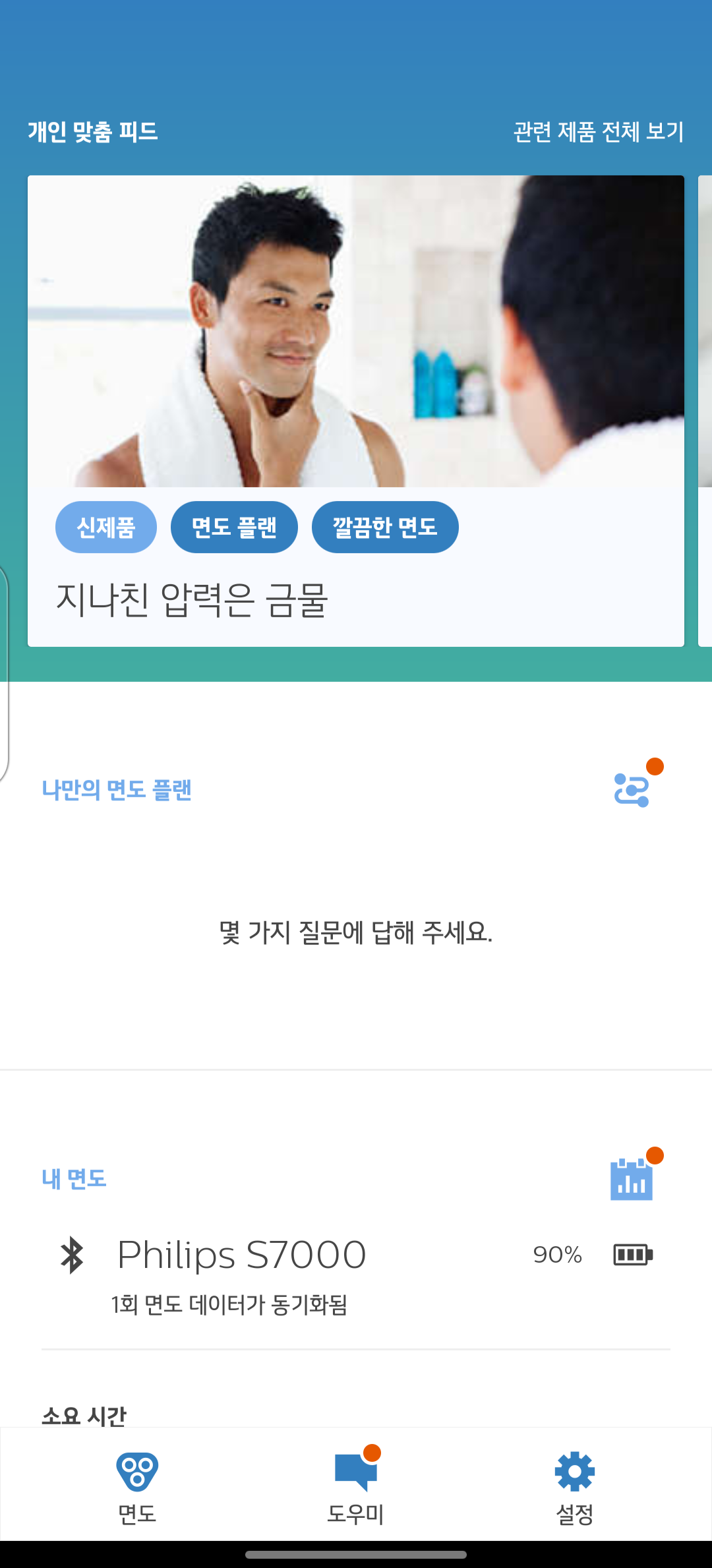 이후 면도기를 다시 연결하게 되는데, 그때 면도기 전원을 켜주면 바로 앱과 동기화 되고, 이후 계속해서 정상적으로 동기화가 이루어질 겁니다.