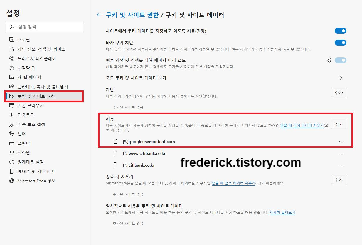 그리고 [쿠키 및 사이트 데이터]에로 갑니다