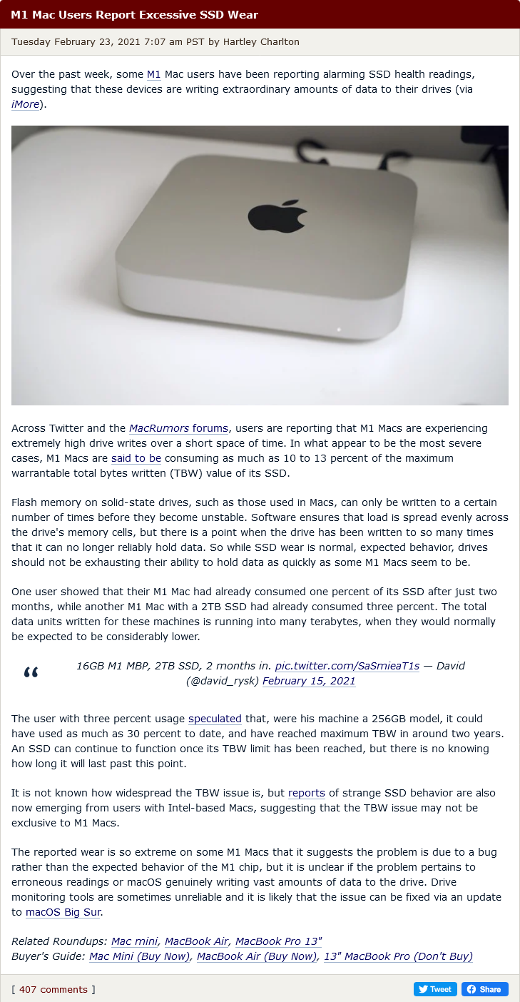 출처: macrumors.com 해외의 수많은 애플 관련 커뮤니티에서 사용자들이 보고 하고 있는 바에 따르면, M1 탑재 맥에서 SSD를 과도하게 쓰는 문제가 나타나고 있다고 합니다. 작년 11월에 발표한, 그래서 이제 3개월 밖에 되지 않은 제품의 SSD 웨어률이 10%를 넘나드는 현상입니다.