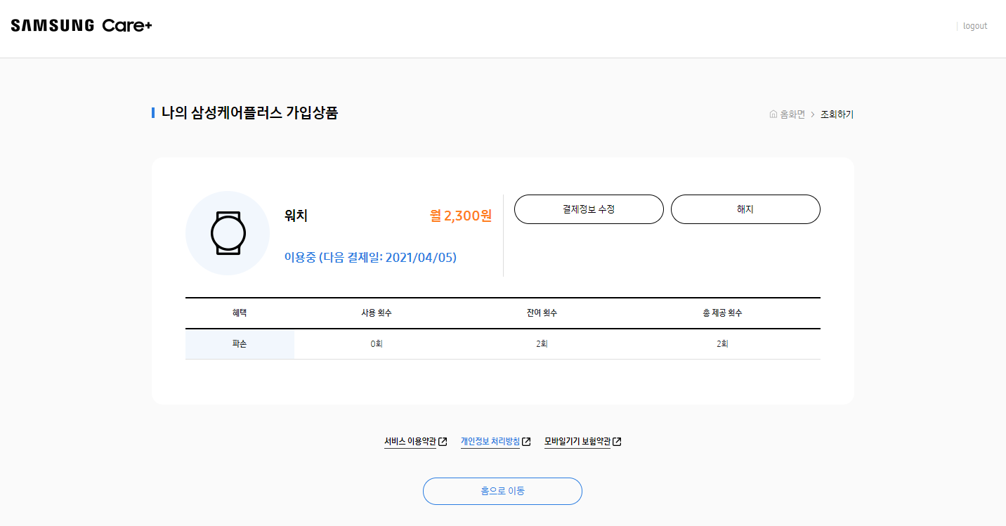 중도해지를 원하는 경우 위의 콜센터로 연락하거나 혹은 홈페이지 www.samsungcareplus.com/kr 에서도 도 가능합니다