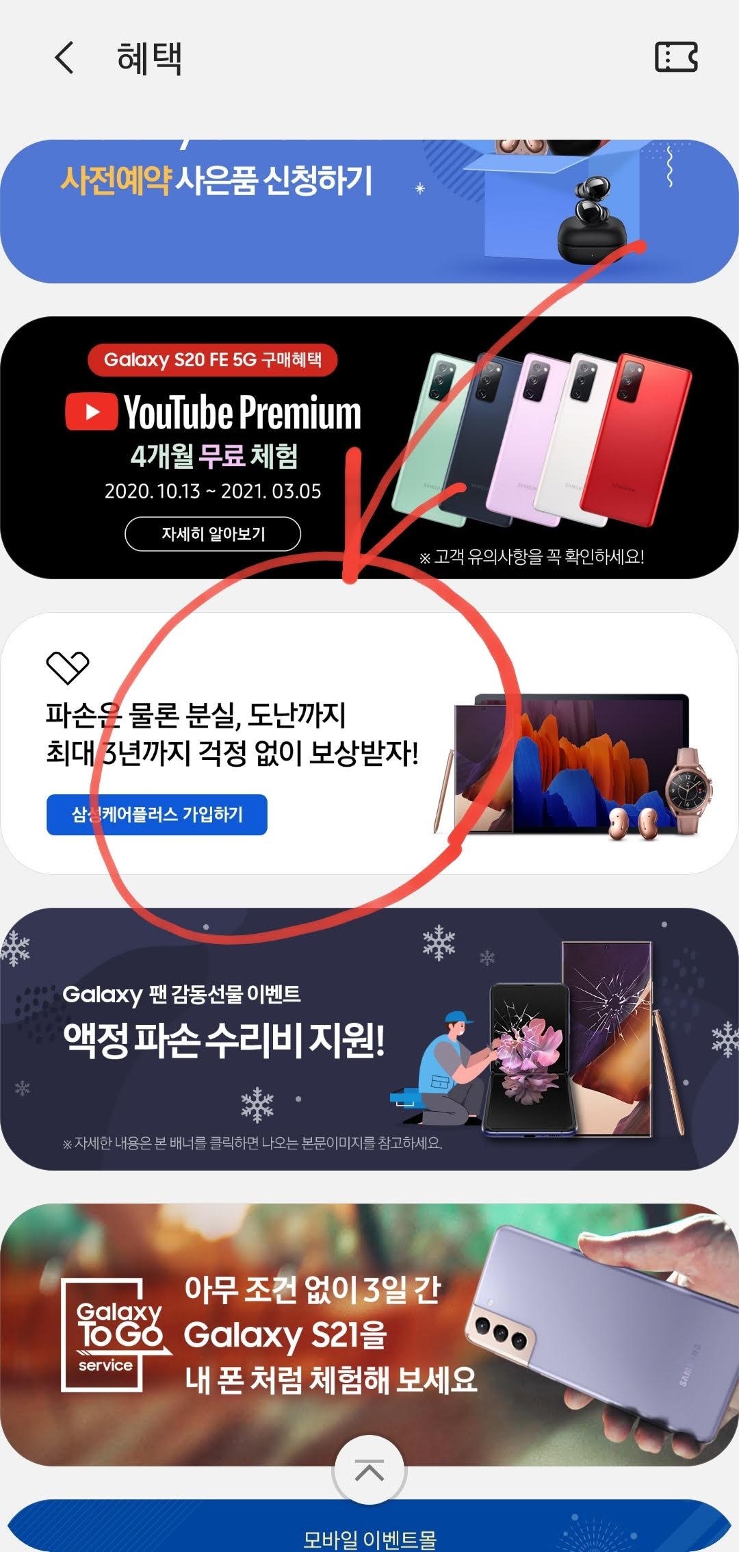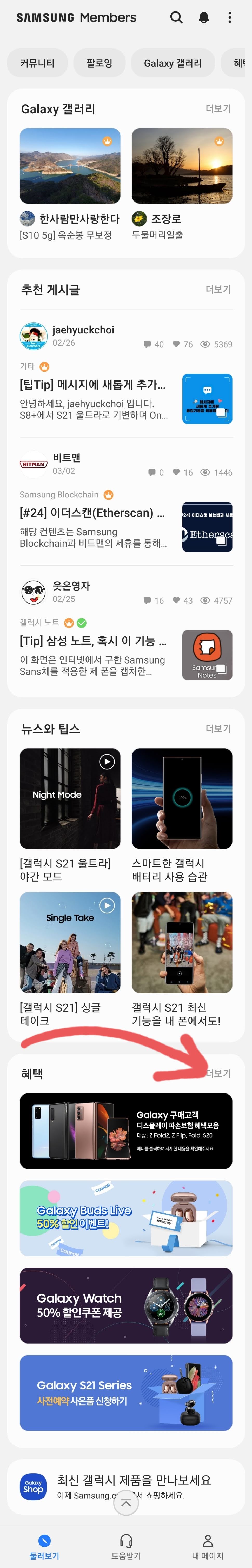 삼성 멤버스를 통하면 됩니다. 삼성 멤버스 앱에 들어가서, 아래로 쭈욱 내려서 배너가 있는 곳으로 갑니다 +_+ [혜택]이라고 된 곳에서 [더 보기]를 눌러 주세요!