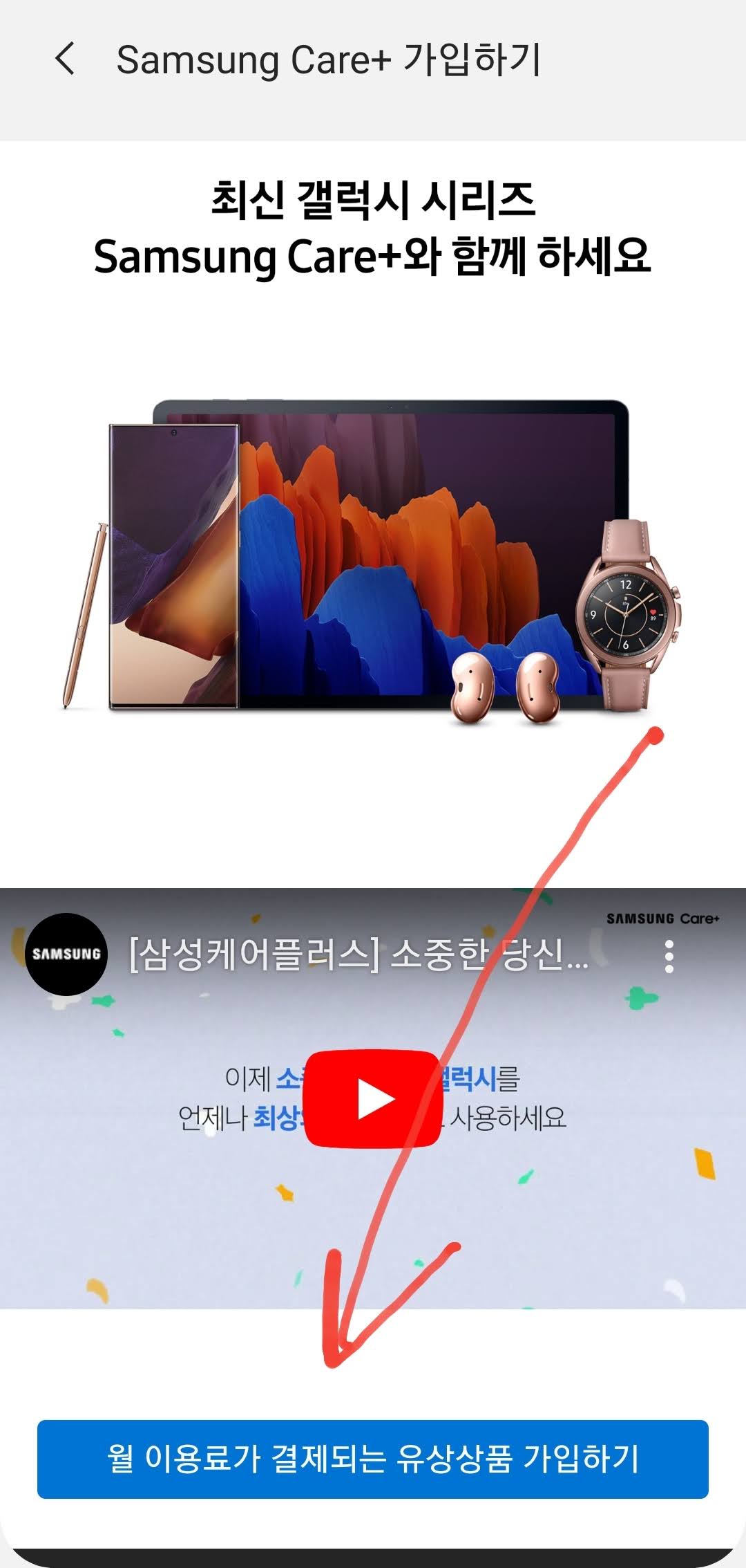 그리고 그 안에서 잘 살펴 보면 [삼성 케어 플러스 가입하기]라는 배너가 보일 겁니다. 여기로 들어 갑니다 +_+