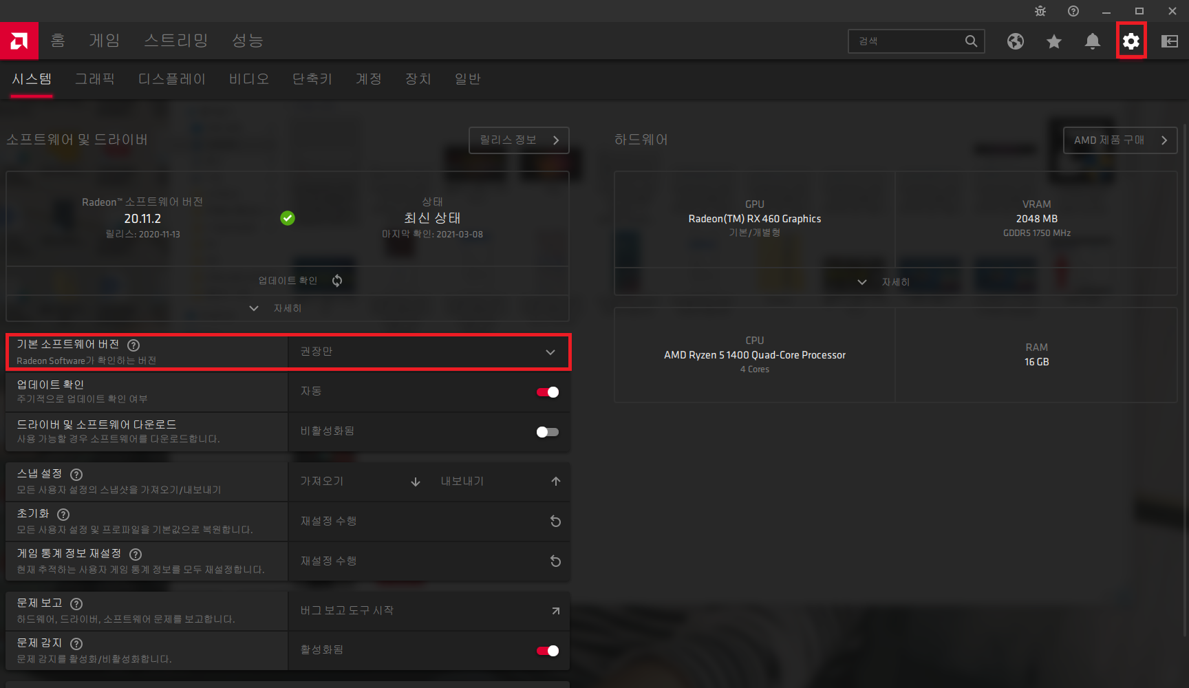바탕화면에서 마우스 우클릭을 하면 AMD Radeon Software라는 이름이 보일 겁니다. 그걸 클릭한 뒤에, 화면 오른쪽 상단의 톱니바퀴 아이콘을 클릭하면 아래와 같이 나올 겁니다.