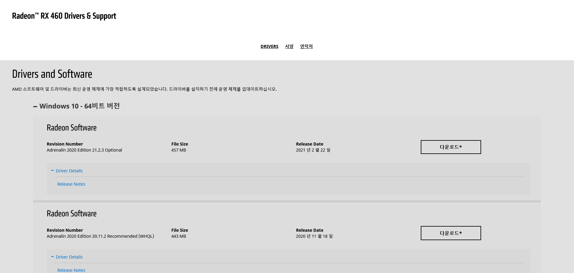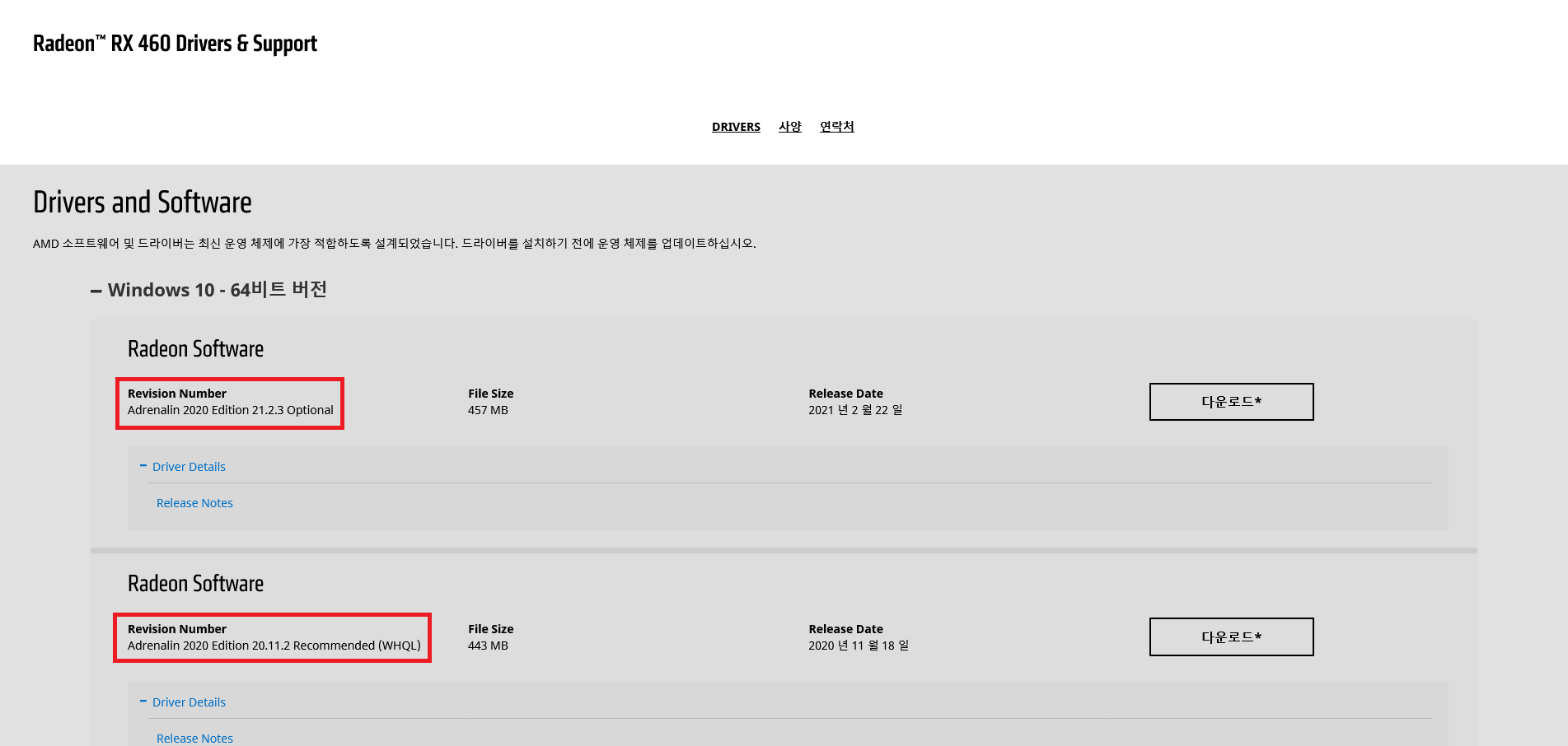 하나는 Revision Number - Adrenalin 2020 Edition 21.2.3 Optional 또 다른 하나는 Revision Number - Adrenalin 2020 Edition 20.11.2 Recommanded (WHQL) 이라고 나와 있죠.
