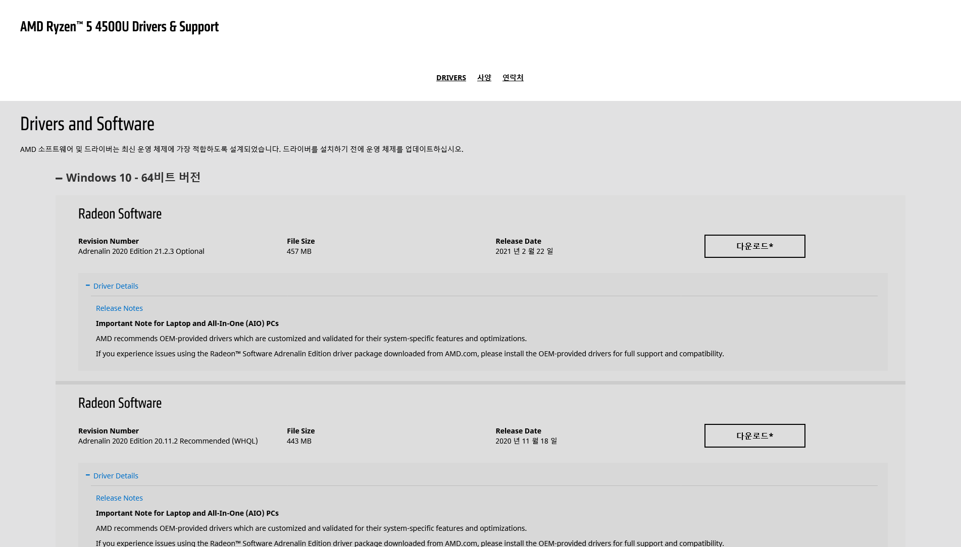 일반적으로 노트북용 드라이버는 노트북 제조사를 통해서 받을 것을 권장합니다. 이는 AMD 뿐만 아니라 인텔도 마찬가지입니다. 제품별 기능 차이와 최적화 등의 이유로 제조사에서 제공하는 드라이버를 이용하는 것이 가장 좋습니다만, 제조사에서 드라이버 업데이트를 하지 않는 경우나, 불편이 있는 경우에 한해서 이 방법을 시도하시되, 특정 기능이 의도대로 동작하지 않을 수도 있음을 알려 드립니다.