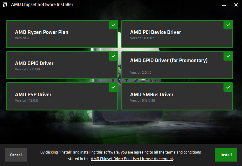 AMD 칩셋 드라이버 안에는 이렇게 PSP 드라이버와 SMBus 드라이버 등이 포함 되어 있으며, Install을 누르면 자동으로 일괄 설치가 이루어집니다.