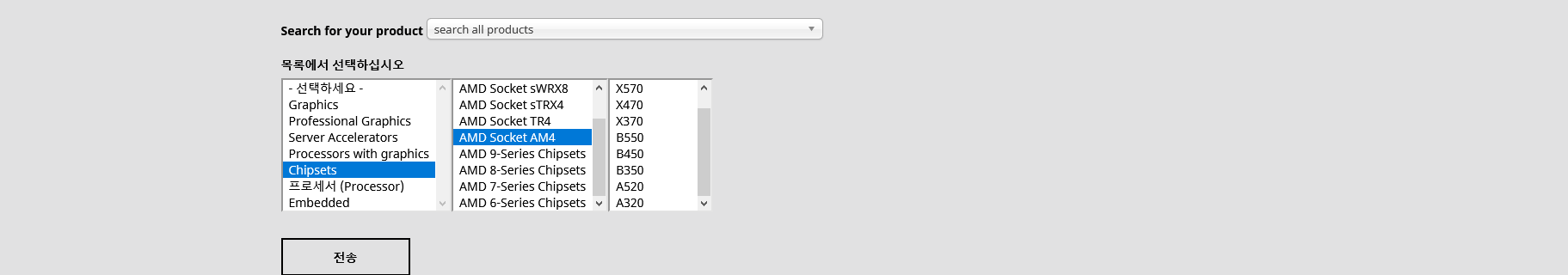 그리고 사용 중인 칩셋을 골라야 하는데, 2021년 3월 기준으로 라이젠 기반 데스크탑을 사용중이시라면 AM4를 선택하시면 됩니다. 라이젠 1세대, 2세대, 3세대 모두 동일하게 AM4 입니다. 그리고 사용 중인 메인보드를 선택합니다. 여기서는 A320 기반 메인보드를 기준으로 해보겠습니다.