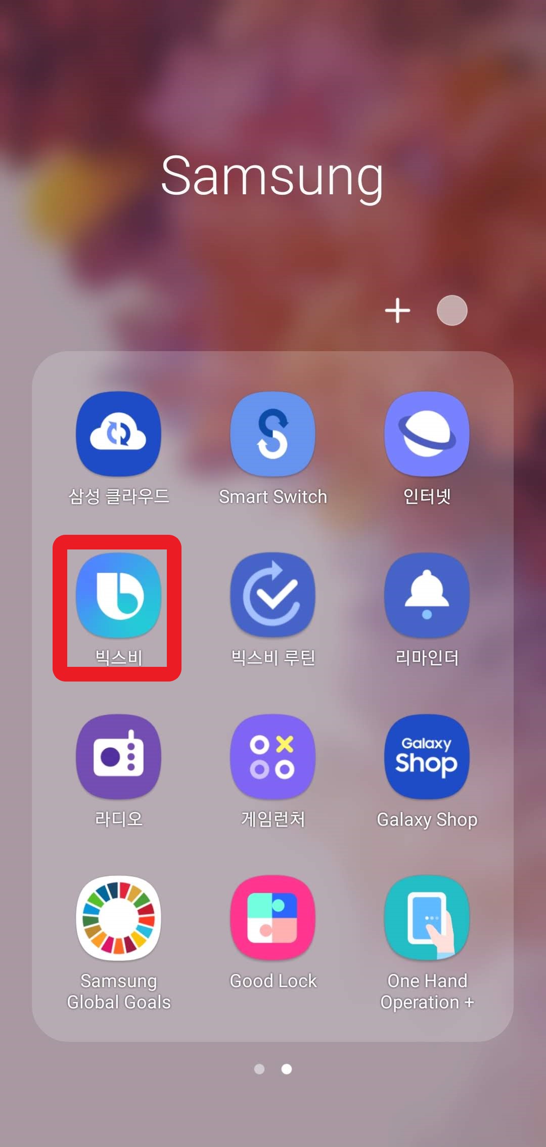 먼저 빅스비 앱을 실행해 봅니다. 만약, 빅스비 앱이 어디 있는지 모르겠다면, 화면을 위로 쓸어 올려서 앱스 화면을 띄운 다음 검색 창에 빅스비라고 입력해 보세요.