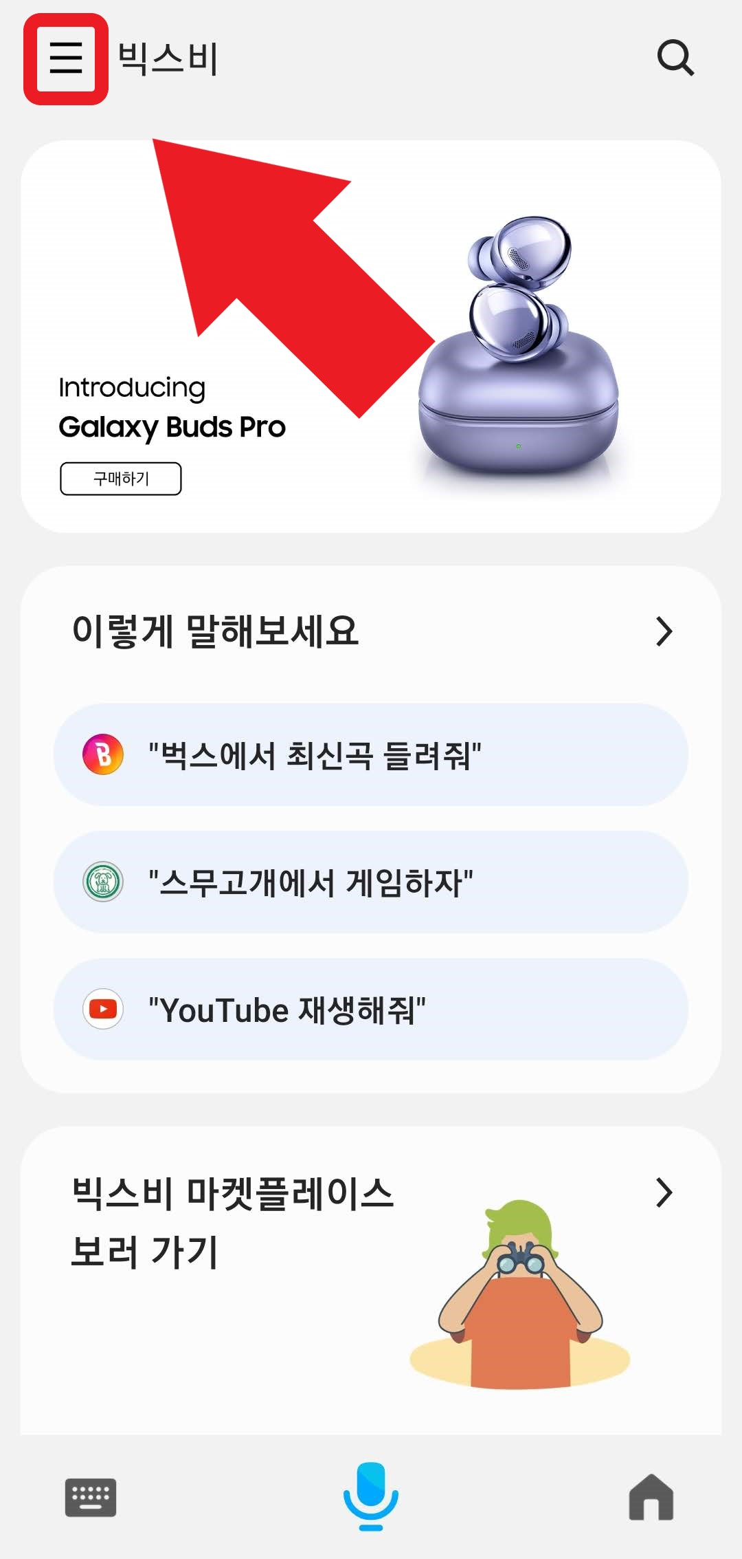 자, 이제 화면 왼쪽 상단의 三 자를 눌러서 설정 메뉴를 열고, 여기서 [빅스비 호출]이 켜져 있는지 확인해 보시기 바랍니다.