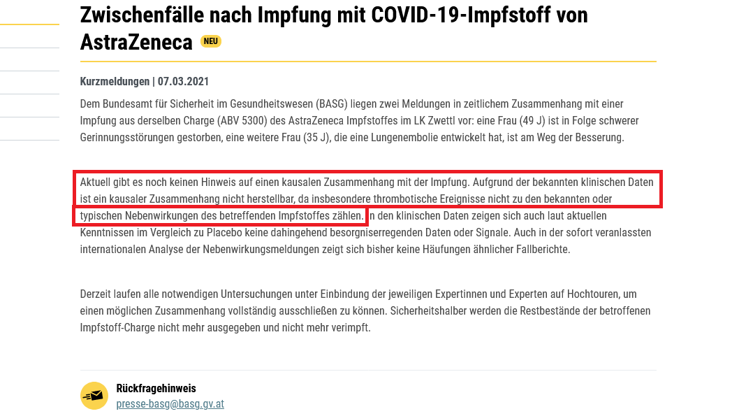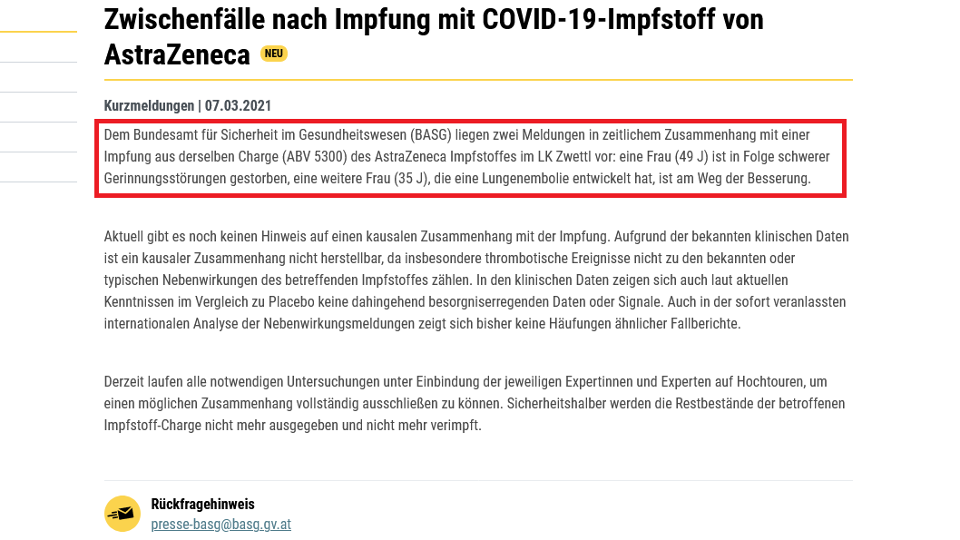 (오스트리아) 연방보건안전국은 (BASG)은 Zwettl 지역에서 AstraZeneca 백신의 동일한 배치 (ABV 5300) 기반의 백신 접종과 관련된 두 가지 보고서를 받음. 한 여성 (49 세)이 심각한 혈전 장애로 사망. 폐색전증을 앓고 있는 다른 여성 (35세)치료 중.