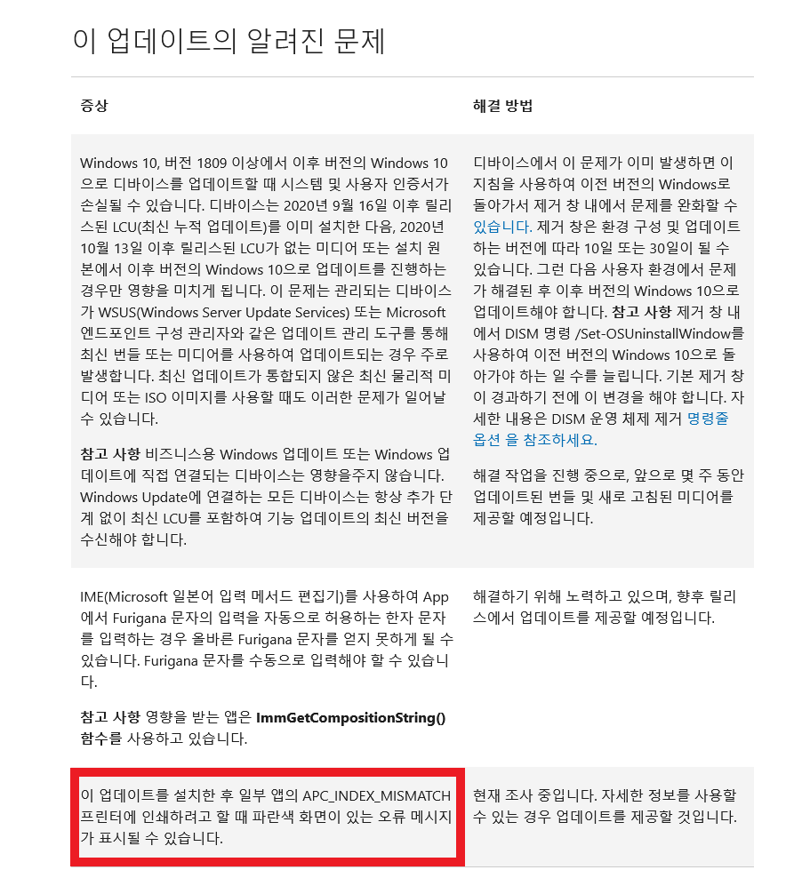 2021년 3월 9일자로 배포 되었던 KB5000802 업데이트의 알려진 문제점입니다. 그러나 모든 시스템에서 문제를 일으키는 게 아닌데다가 그 수가 적어서 그랬는지, 정상 배포가 되었고, 해당 문제에 대해서는 마이크로소프트에서도 인지하고 있다고 합니다.