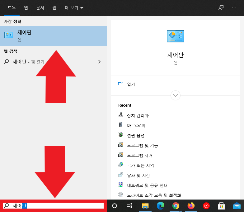윈도우 로고 버튼 바로 옆의 검색 창에 '제어판'이라고 칩니다. 그리고 제어판을 들어가 줍니다.