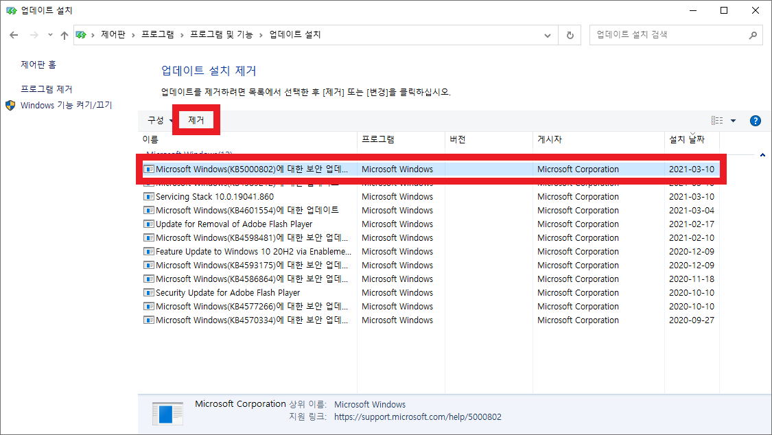 해당 윈도우 업데이트를 제거하면 문제가 해결 됩니다. 그럼 어떻게 제거하면 될까요?