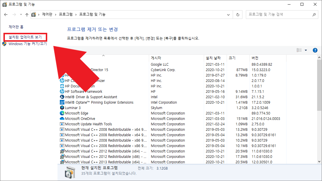 이제 왼쪽 상단의 [설치된 업데이트 보기]를 클릭하여, 윈도우 업데이트 목록을 살펴봅니다.