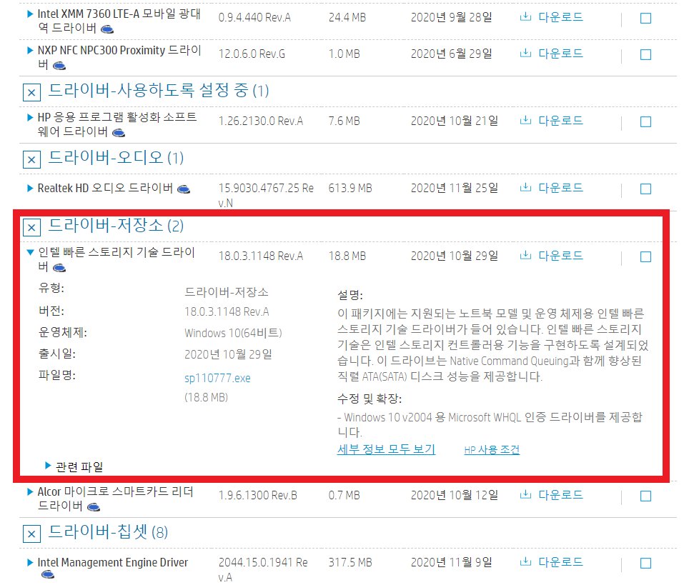 11세대 타이거 레이크부터는 인텔의 새로운 기술을 사용하다보니, 그냥 이렇게만 두면 정상적으로 저장 공간이 인식되지 않는 문제가 있습니다. 이때, 노트북 제조사 홈페이지를 방문하여, '인텔 빠른 스토리지 기술' 혹은 'Intel Rapidstorage Technology' 프로그램을 다운로드 해야 합니다.