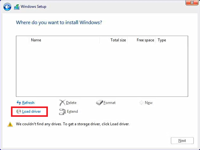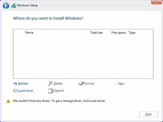 원래 부팅용 USB를 가지고 윈도우 설치를 시작하면, 위와 같은 화면에서 내부 저장소가 나와야 합니다. 그런데 11세대나 12세대 기반 노트북에서 그냥 진행하면, 위의 화면처럼 아무것도 보이지 않게 됩니다. 이것 때문에 별도 과정이 필요한 겁니다.