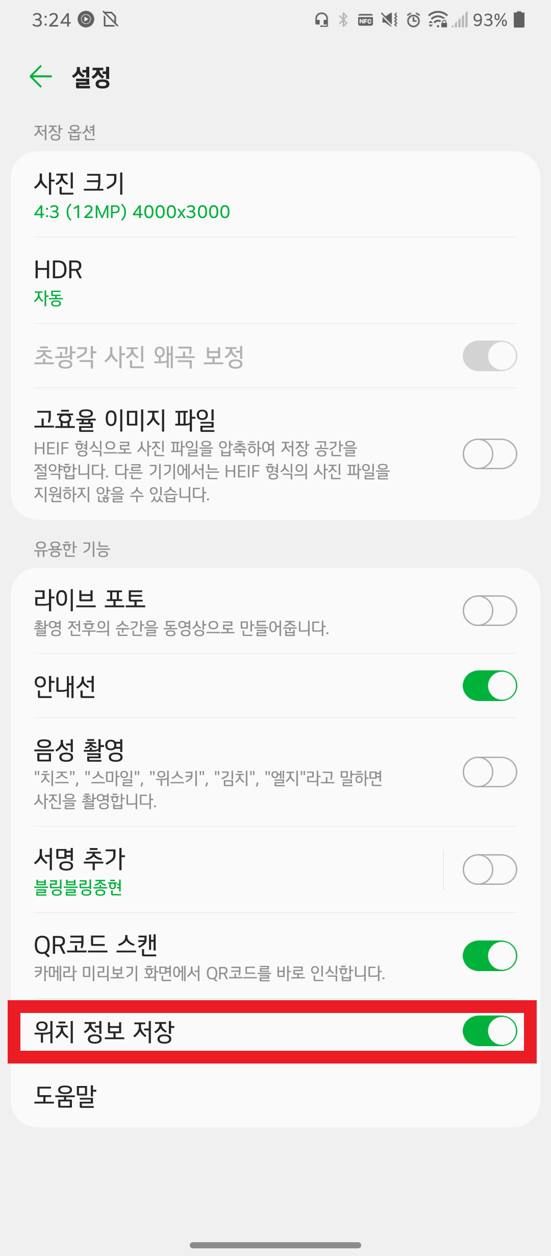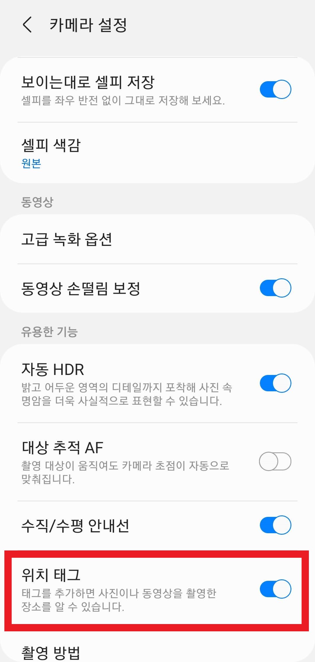 카메라 앱을 실행하고 화면 상단의 톱니바퀴 아이콘을 눌러서 설정에 들어가 보면 위와 같은 옵션이 보일 겁니다. 엘지는 [위치 정보 저장]이라고 되어 있고, 삼성은 [위치 태그]라고 되어 있습니다. 이 부분을 켜면, 사진 촬영시 GPS 등을 이용하여 사진에 위치 정보를 저장합니다. 이걸 끄면 아예 위치 기록이 사진에 담기지 않게 됩니다.