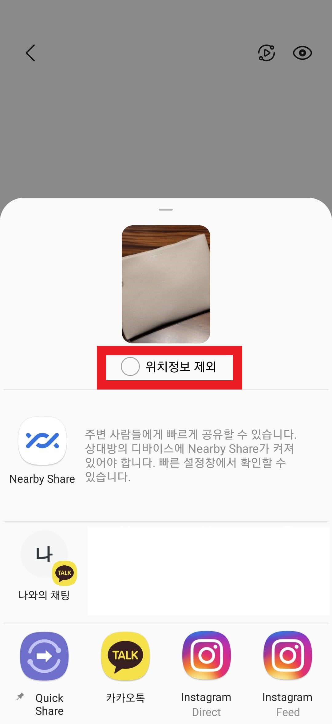 갤러리에서 사진을 선택하고 공유버튼을 누르면 위와 같이 [위치 정보 제외]라는 옵션이 나옵니다. 여기를 선택하고 전송하면 사진에서 위치 정보는 빠지게 됩니다. 간단하지만 요긴하죠? :-)