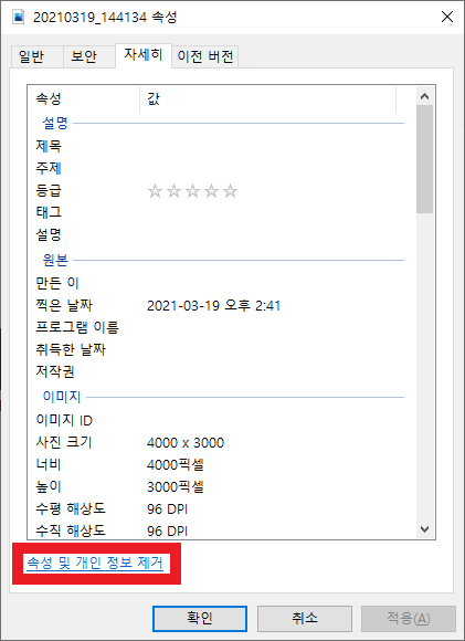 이 [자세히] 탭의 맨 아래를 보면 [속성 및 개인정보 제거]라는 부분이 보일 겁니다. 여기를 누르고, [제거 가능한 모든 속성을 제거하고 복사본 만들기]를 선택, 그리고 [확인]을 누르면, 같은 파일의 복사본이 생성 됩니다.