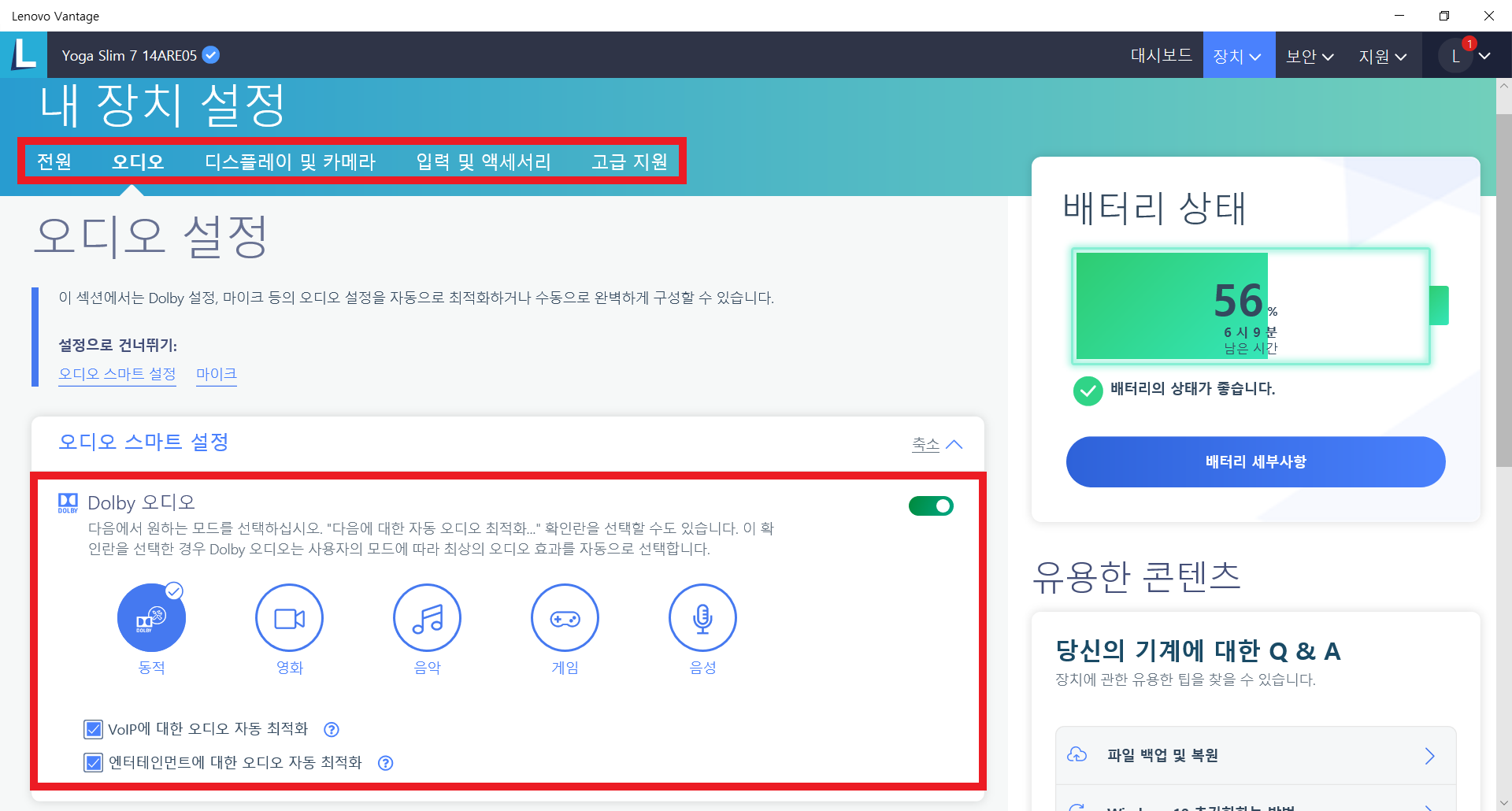 다음은 [오디오] 부분에서, 지원되는 모델에 따라서는 Dolby 기능을 활용할 수도 있습니다. 여기에서 [동적]으로 설정하면 시스템에서 자체적으로 알아서 소리를 맞춰줍니다. 그리고 [VoIP에 대한 오디오 자동 최적화] 기능은 노트북에서 화상이나 음성 통화를 할 때, 소리를 최적으로 맞춰주는 기능이고, [엔터테인먼트에 대한 오디오 자동 최적화]는 재생 중인 컨텐츠에 따라 최적화를 해주는 걸 말합니다. 예를 들어 음악을 들을 때와 영화를 볼 때, 혹은 게임을 할 때 좀 더 생생하게 즐길 수 있도록 튜닝을 달리 해주는 겁니다.