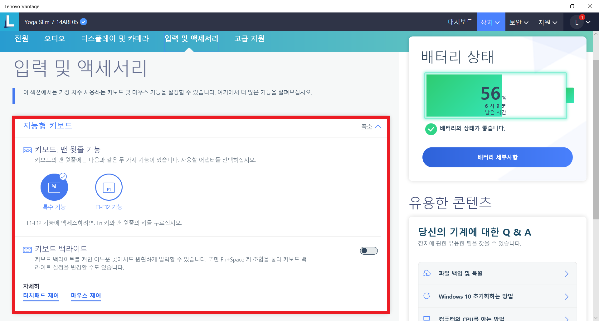 마지막으로 키보드 부분입니다. 요즘 노트북들은 기본적으로 F1부터 F12까지의 키를 미디어 제어 등으로 사용하고 있죠? 그래서 오피스나 한글 등을 키보드를 이용해서 많이 쓰시는 분들께는 불편할 수도 있습니다. 그럴 때는 여기에서 F키들을 특수 기능으로 사용할 것인지, 아니면 각각의 프로그램에서 사용하는 기능으로 쓸 것인지 결정할 수도 있습니다.