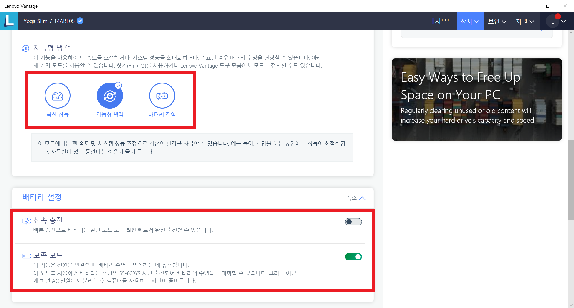 그런데 우리가 배터리 충전 용량을 봐가면서 전원 선을 뺐다가 꼈다가 하기에는 너무 귀찮고 번거롭잖아요? 그래서 LenovoVantage에서는 [보존 모드]라는 기능을 제공하고 있습니다. 이 기능을 켜면, 전원을 연결해 두더라도 일정 이상은 충전하지 않습니다. 대략 60% 정도 선에 다다르면 전원에 연결 되어 있더라도 더 이상 충전을 하지 않음으로써, 배터리 자체의 수명을 아껴주는 기능이죠. 다만, 이 기능을 활용할 경우 [신속 충전] 기능을 사용할 수 없습니다. 서로 상충되는 기능이니까요. [신속 충전] 기능을 켜서 충전 속도를 극대화 하는 기능도 있으니, 선택은 여러분의 몫입니다.