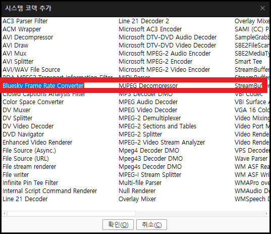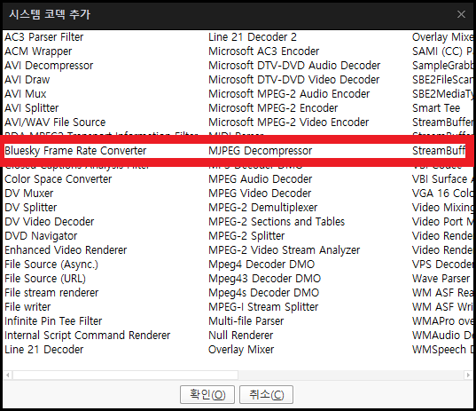 먼저 [전역 필터 우선 순위] 부분에서 [시스템 코덱 추가]를 누릅니다. 그러면 아래와 같은 화면을 볼 수 있는데 여기에서 [Bluesky Frame Rate Converter]를 선택하고 돌아옵니다.