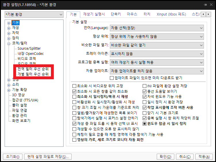 팟플레이어를 오른쪽 클릭해서 [환경설정]을 연다음, [전역 필터 우선 순위]와 [개별 필터 우선 순위] 부분을 변경해 줄 겁니다.