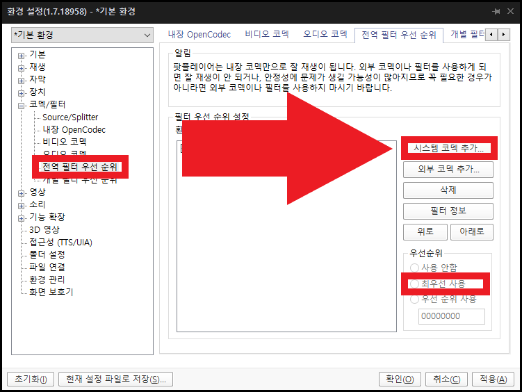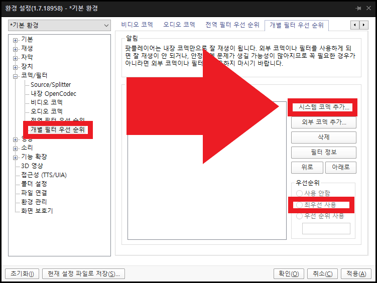 그리고 해당 코덱을 선택한 다음 [최우선 사용]을 눌러줍니다. 다음으로 [개별 필터 우선 순위] 설정입니다.