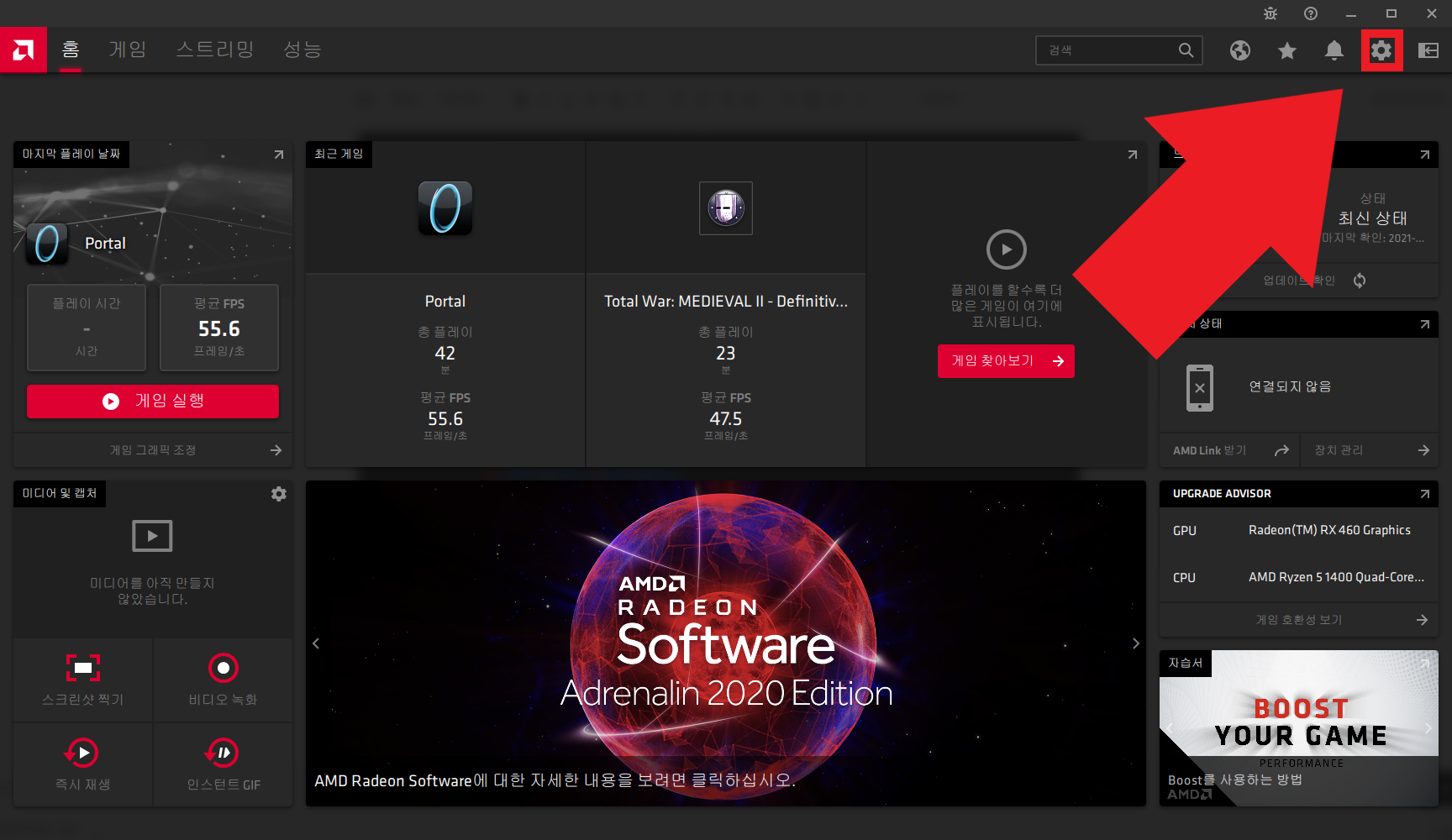 화면 오른쪽 상단의 톱니바퀴 아이콘을 눌러서 설정으로 들어갑시다