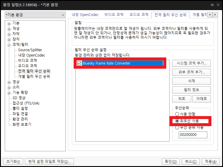 같은 방법으로 Bluesky Frame Rate Converter를 선택한 다음, [최우선 사용]까지 선택하면 끝입니다. 이제 영상을 재생해 보면 훨씬 부드럽고 매끄럽게 재생되는 걸 알 수 있습니다.