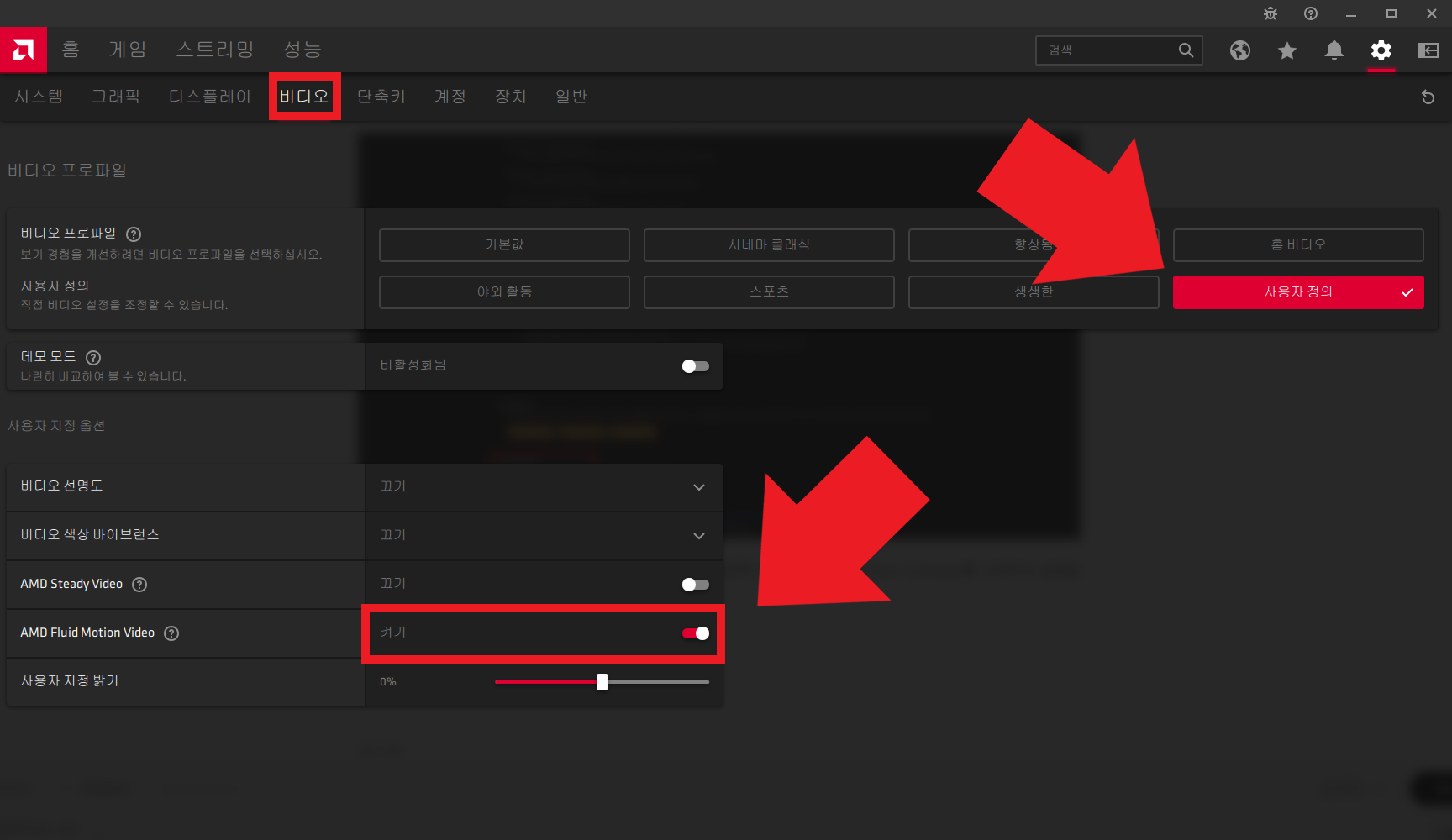 그 다음 [비디오] 탭에서 비디오 프로파일을 [사용자 정의]로 선택하고 아래의 AMD Fluid Motion Video를 활성화시켜 줍니다. 참고로 르누아르 탑재 노트북 유저들은 위의 Radeon Software가 좀 다를 수 있습니다. 경우에 따라서는 Radeon Software Lite라는 버전이 설치되어 있을 수 있습니다. 그때는 위의 과정을 패스하고 아래로 진행하시면 됩니다.