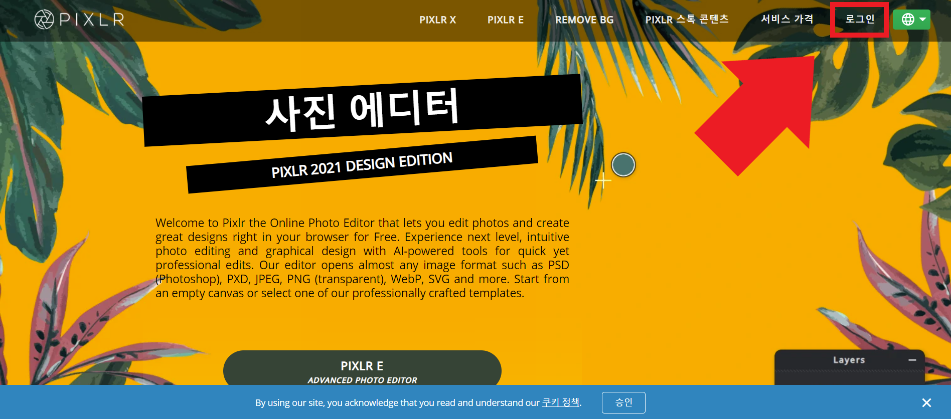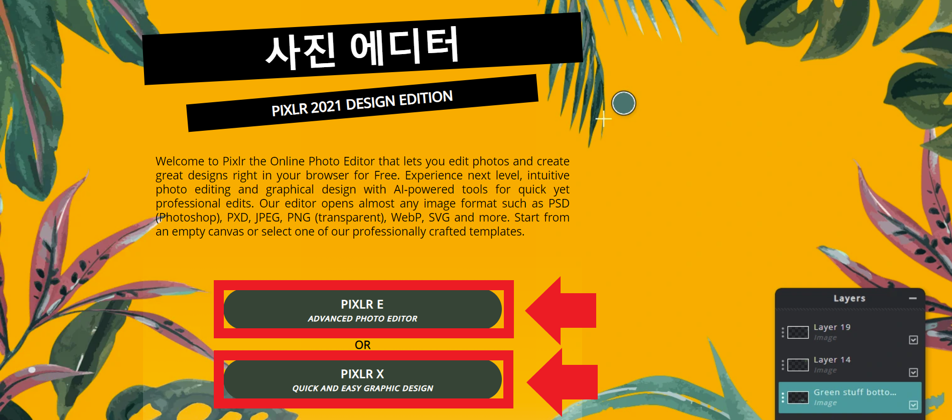 Pixlr (픽슬러)는 웹기반의 무료 이미지 편집 서비스입니다. 온라인으로 제공하는 서비스라서 별도의 설치가 필요하지 않고, 언제든 웹 브라우저만 있으면 사용할 수 있다는 장점이 있습니다. 그리고 한글입니다 😍 꼭 뭘 찾았다 하면 영어로만 제공되어서 불편하셨던 적이 많았을 텐데, 이건 한글이기 때문에 좋습니다.