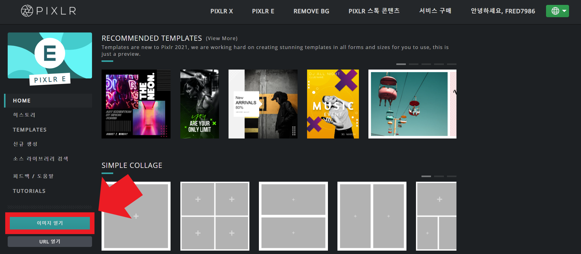 Pixlr E든 Pixlr X든 들어가 보시면 위와 같은 화면을 보실 수 있는데, 이때 왼쪽 아래의 [이미지 열기]를 누르시면 기존에 가지고 계셨던 이미지를 열어서 직접적으로 편집할 수 있는 화면이 나올 겁니다. 기존의 탬플릿을 가지고 사용할 수도 있고, 콜라주 이미지 만들기 등 손쉬운 편집 기능들도 제공하니까 사용해 보세요 😀
