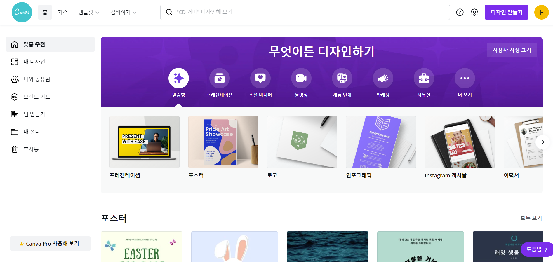 이번에는 좀 더 손쉽게 그럴싸한 이미지를 만들어 내는 방법을 소개합니다. Canva라는 서비스인데요, 이것도 예전에는 한글을 지원하지 않았는데 이제 우리말도 나오고 좋네요.