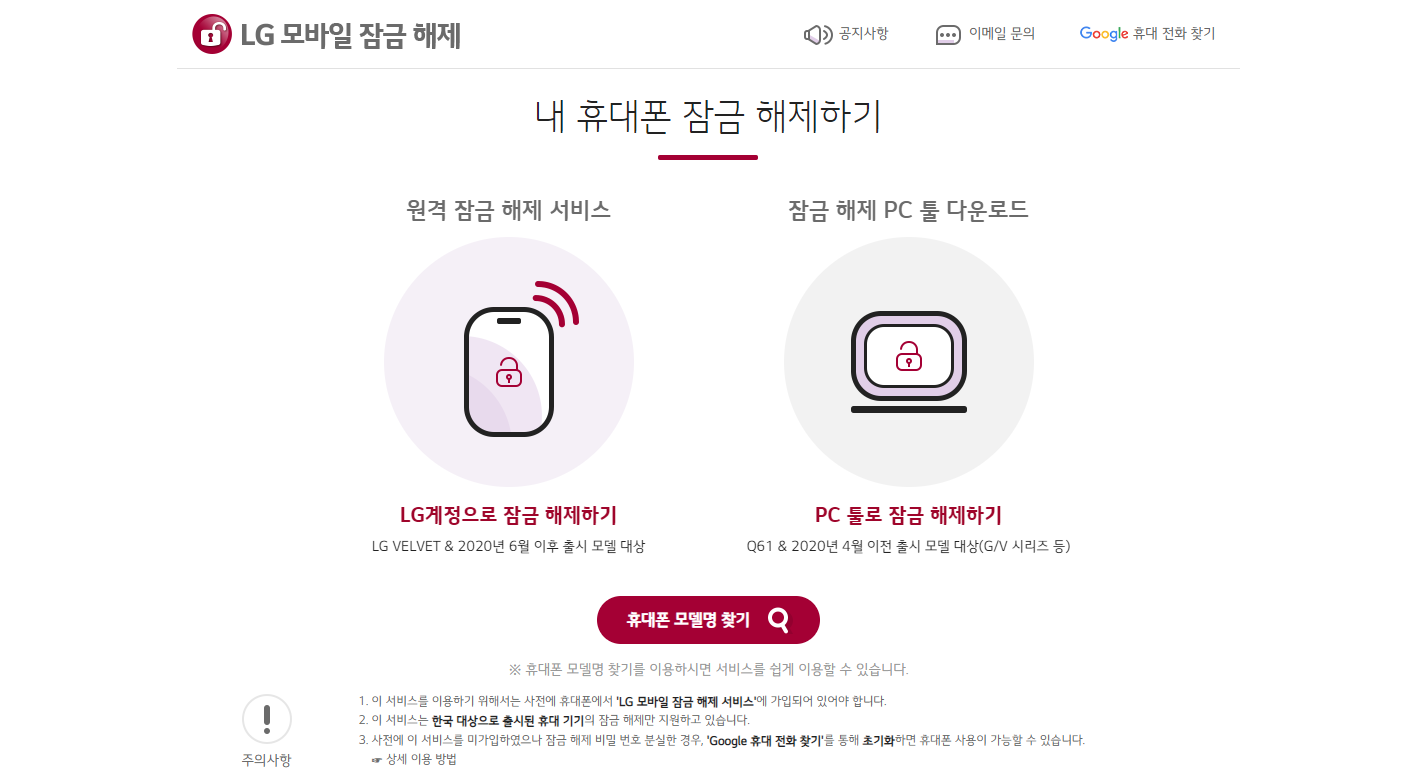 내 휴대폰 잠금 해제하기 원격 잠금 해제 서비스 LG계정으로 잠금 해제하기 LG VELVET & 2020년 6월 이후 출시 모델 대상 잠금 해제 PC 툴 다운로드 PC 툴로 잠금 해제하기 Q61 & 2020년 4월 이전 출시 모델