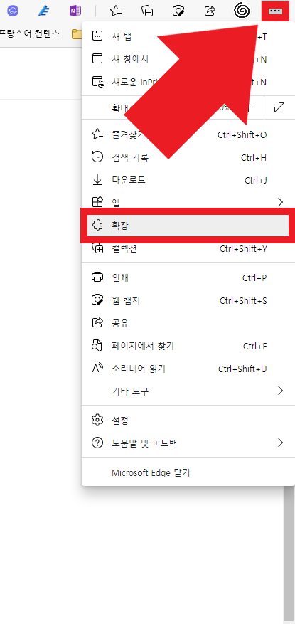 마이크로소프트 엣지 사용자는 이걸 먼저 해주어야 합니다. 브라우저 오른쪽 상단의 점3개 아이콘 클릭 후, [확장]을 누릅니다.
