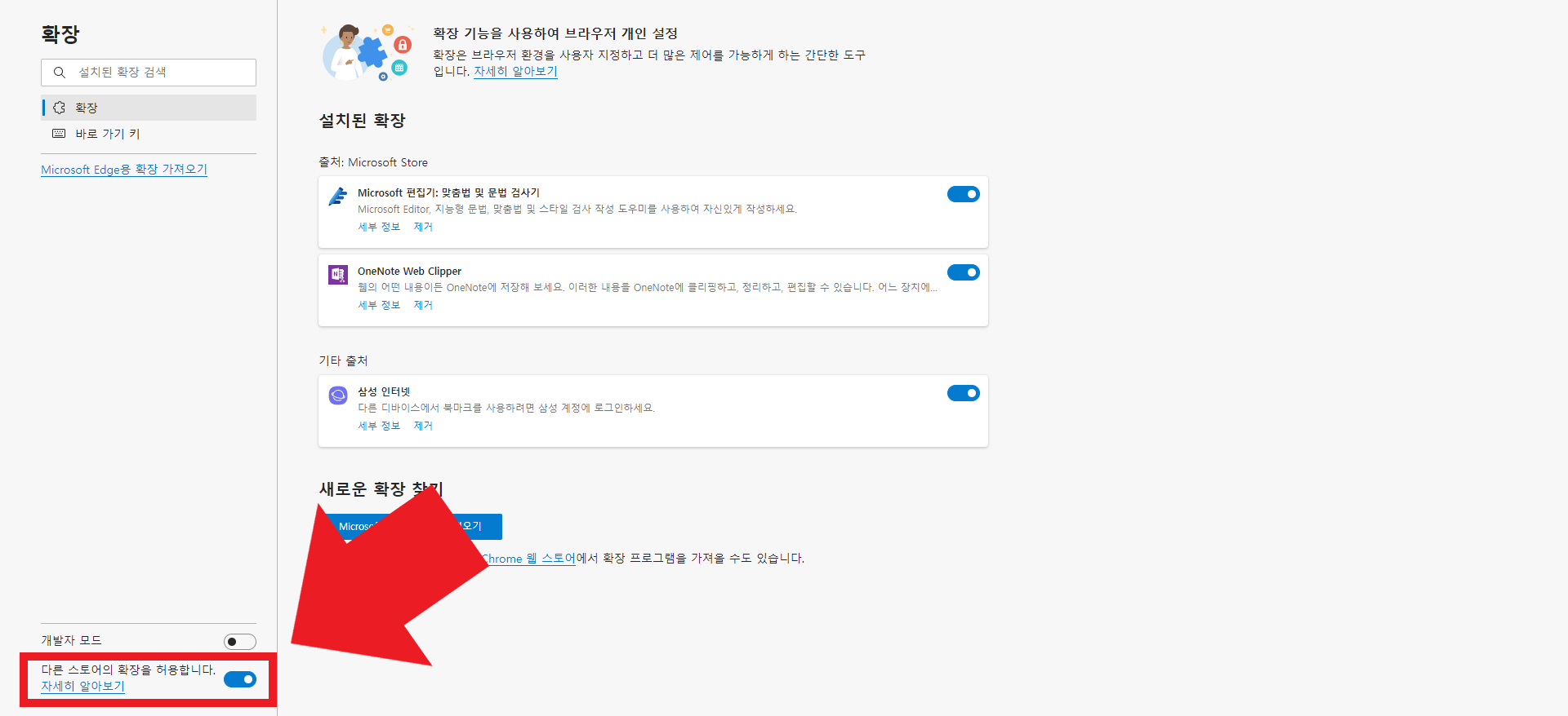 그럼 위와 같은 화면이 보일 텐데, 여기에서 왼쪽 아래의 [다른 스토어의 확장을 허용합니다] 부분을 켭니다. 이렇게 하면 마이크로소프트 스토어 외에 구글 크롬 스토어에서 확장 기능을 받아서 사용할 수 있게 됩니다.