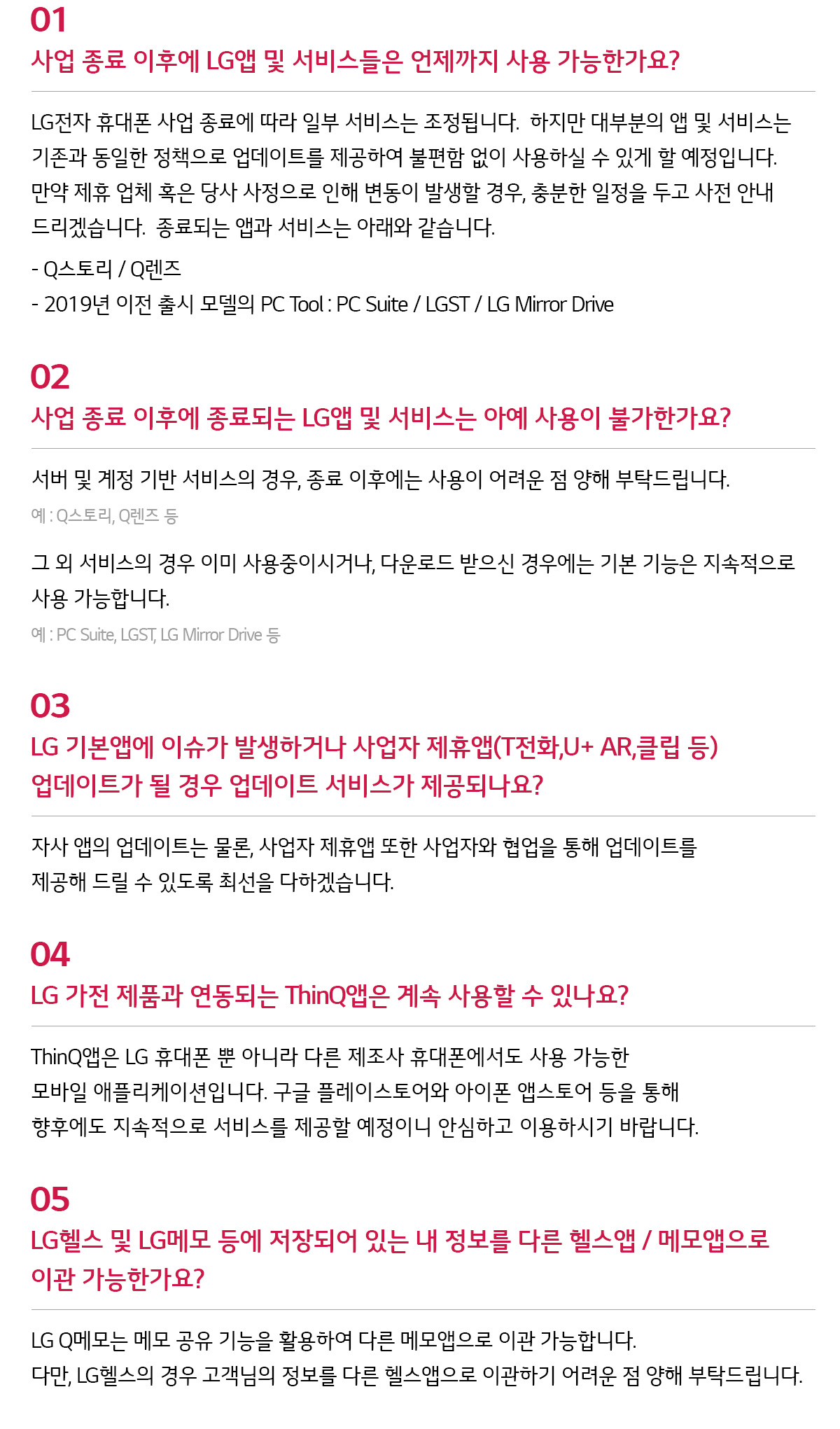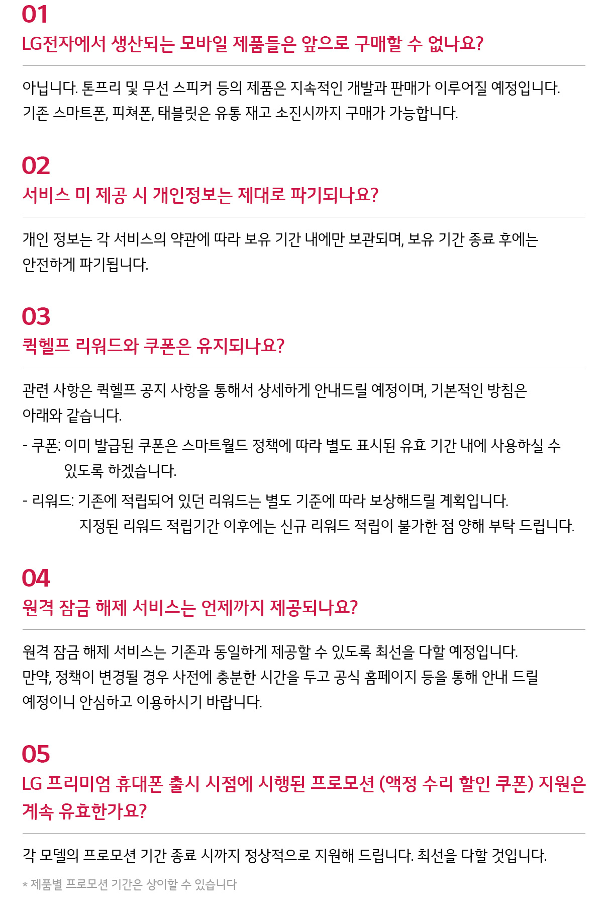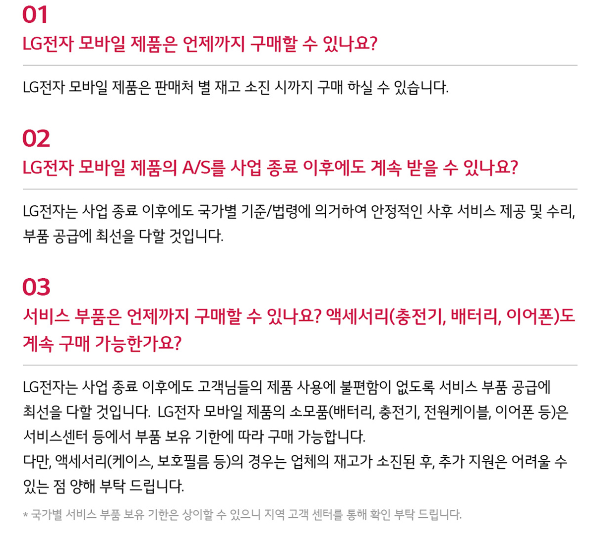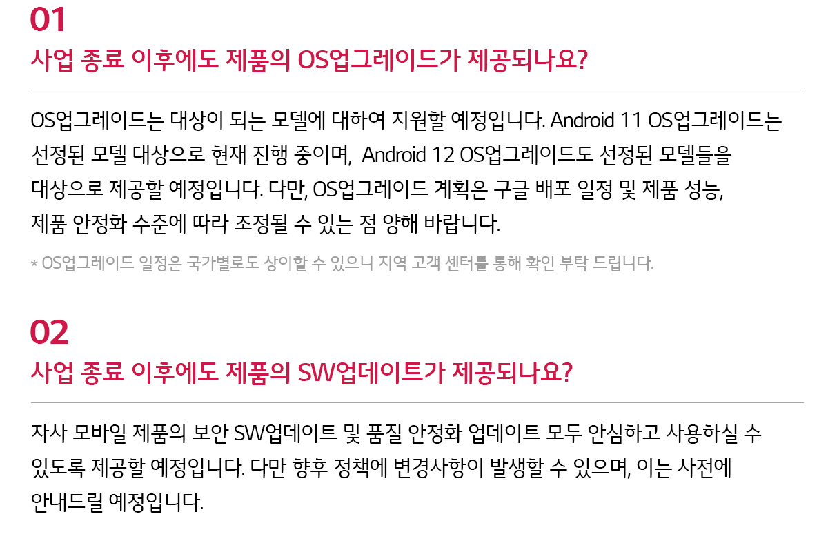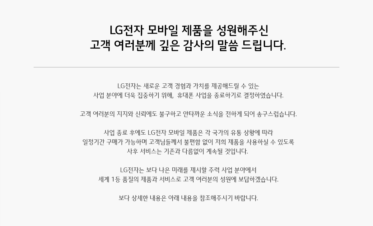 LG전자는 휴대폰 사업 종료 이후에도 구매 고객 및 기존사용자가 불편을 겪지 않도록 충분한 사후 서비스를 지속한다.