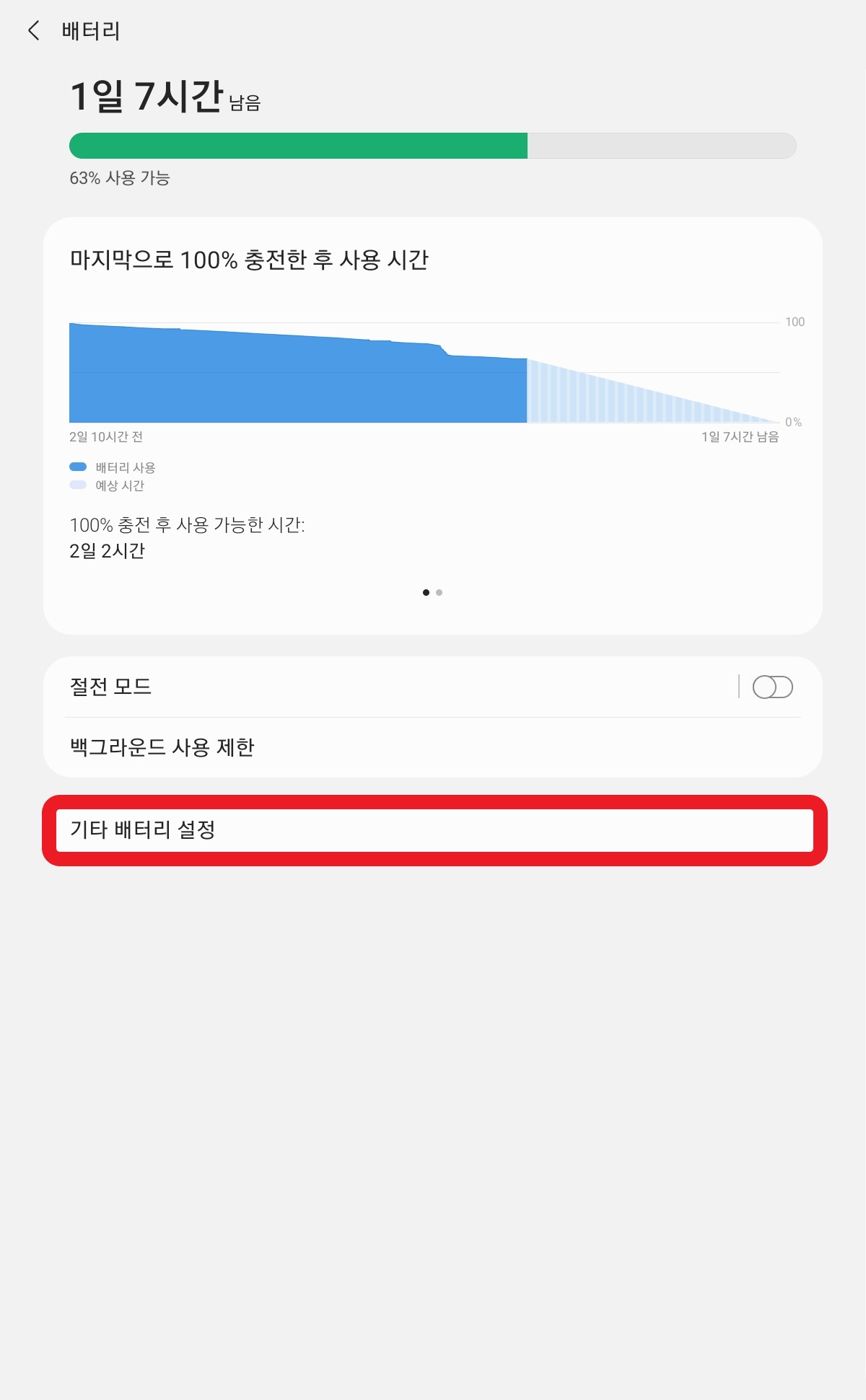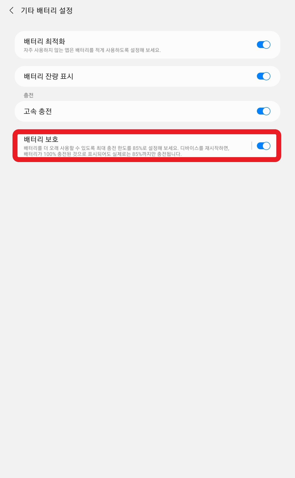 [기타 배터리 설정]에서 [배터리 보호] 항목을 켜면 됩니다. 참고로 이 기능을 활성화할 때, 한번 태블릿은 재시작해야 합니다. 그러면 앞으로 배터리가 85% 이상으로 충전되지 않습니다. 아무래도 태블릿은 충전기에 꽂아 두고 방치하는 경우가 많기 때문에 이 기능을 꼭 사용하시는 걸 추천 드립니다!