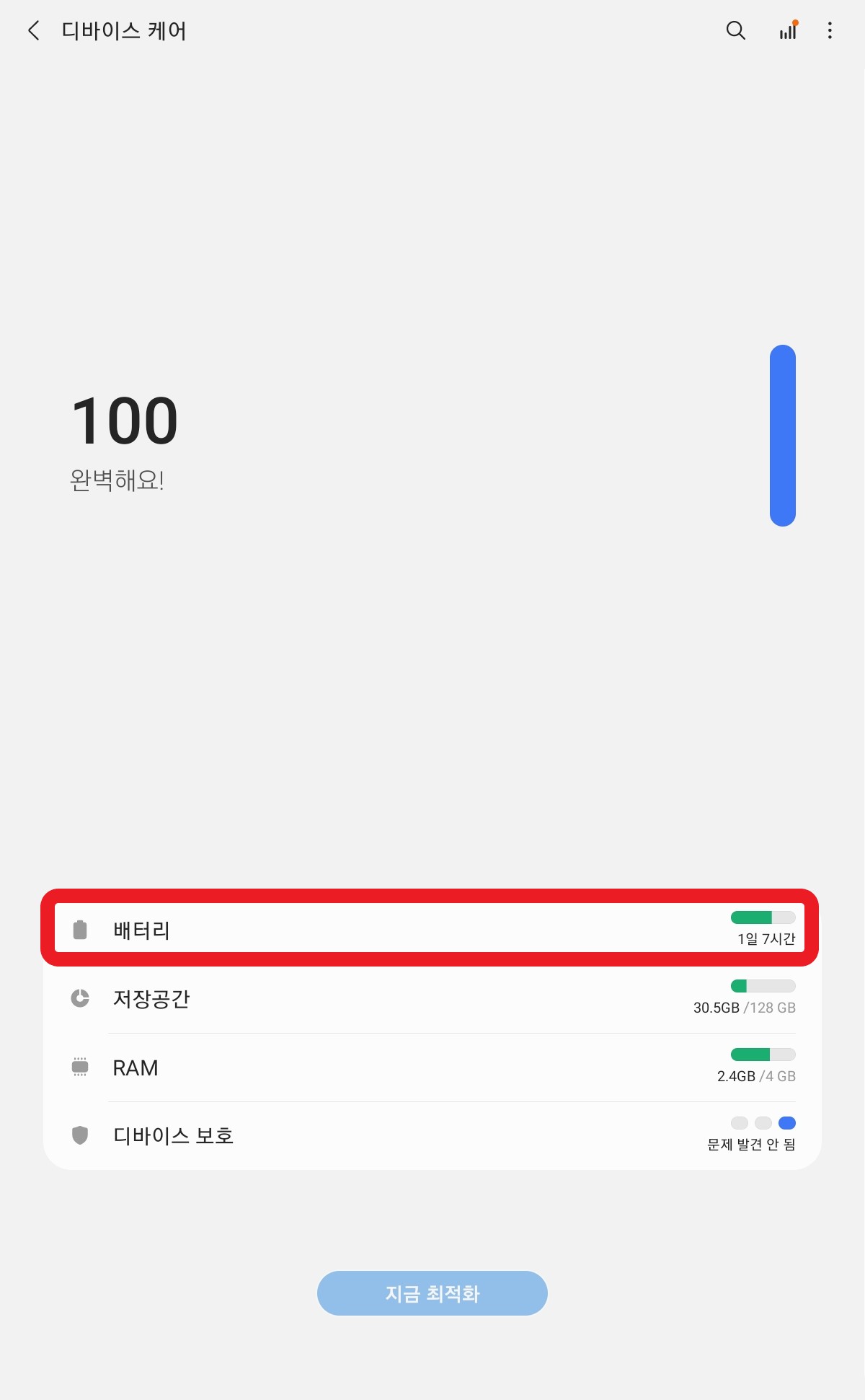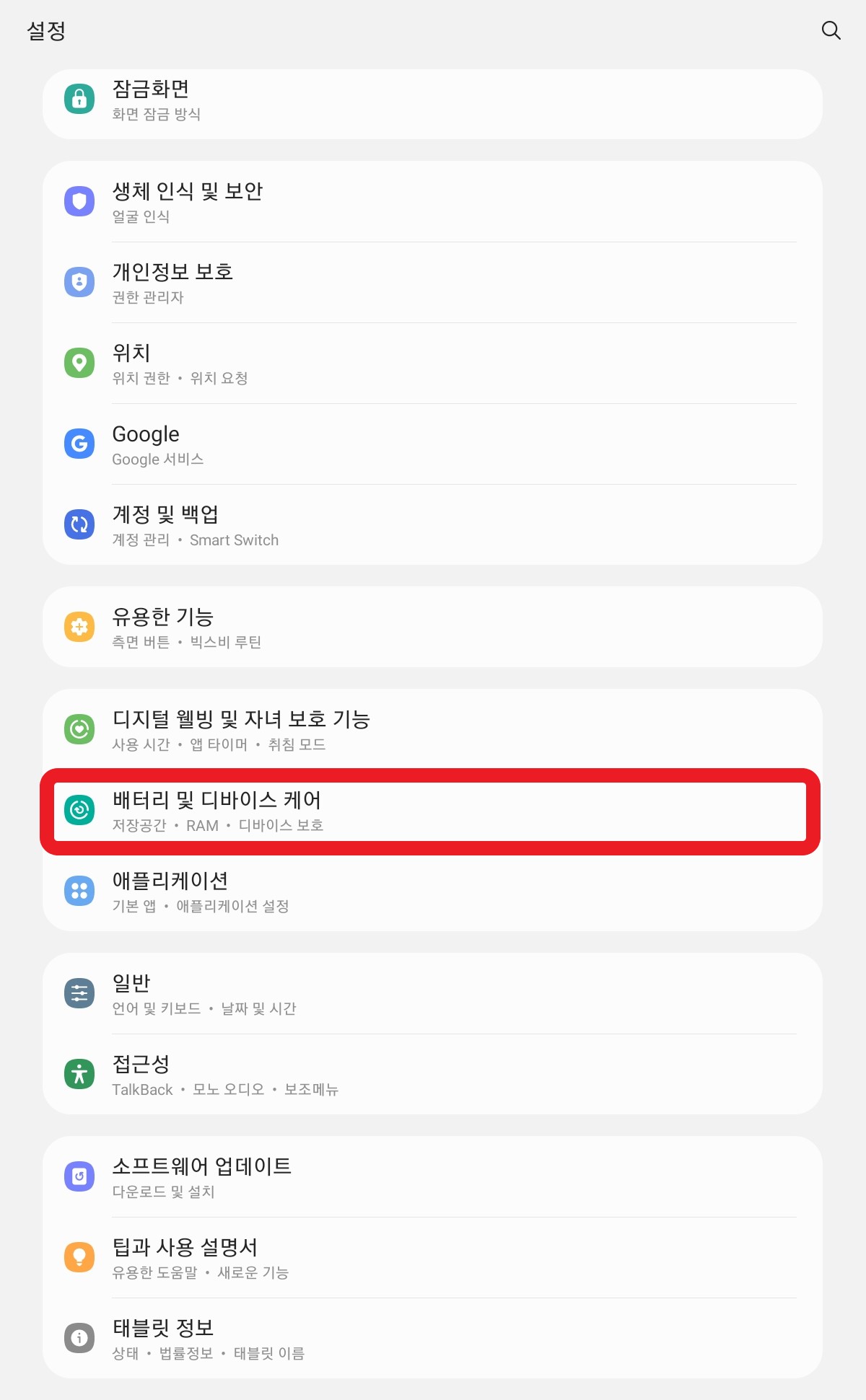 먼저 [설정]으로 들어가서 [배터리 및 디바이스 케어]로 갑니다. 그리고 [배터리] 항목으로 들어가 주세요.