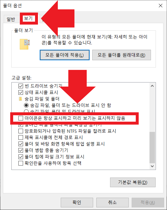 그리고 [보기] 탭에서 내용을 쭉 내리다 보면, [아이콘은 항상 표시하고 미리 보기는 표시하지 않음]이라는 옵션이 있는데 이걸 선택하고 적용하면, 이제 폴더는 아이콘으로만 표시되고 폴더 내용물에 기반한 미리보기는 표시되지 않을 겁니다. 간단하죠?