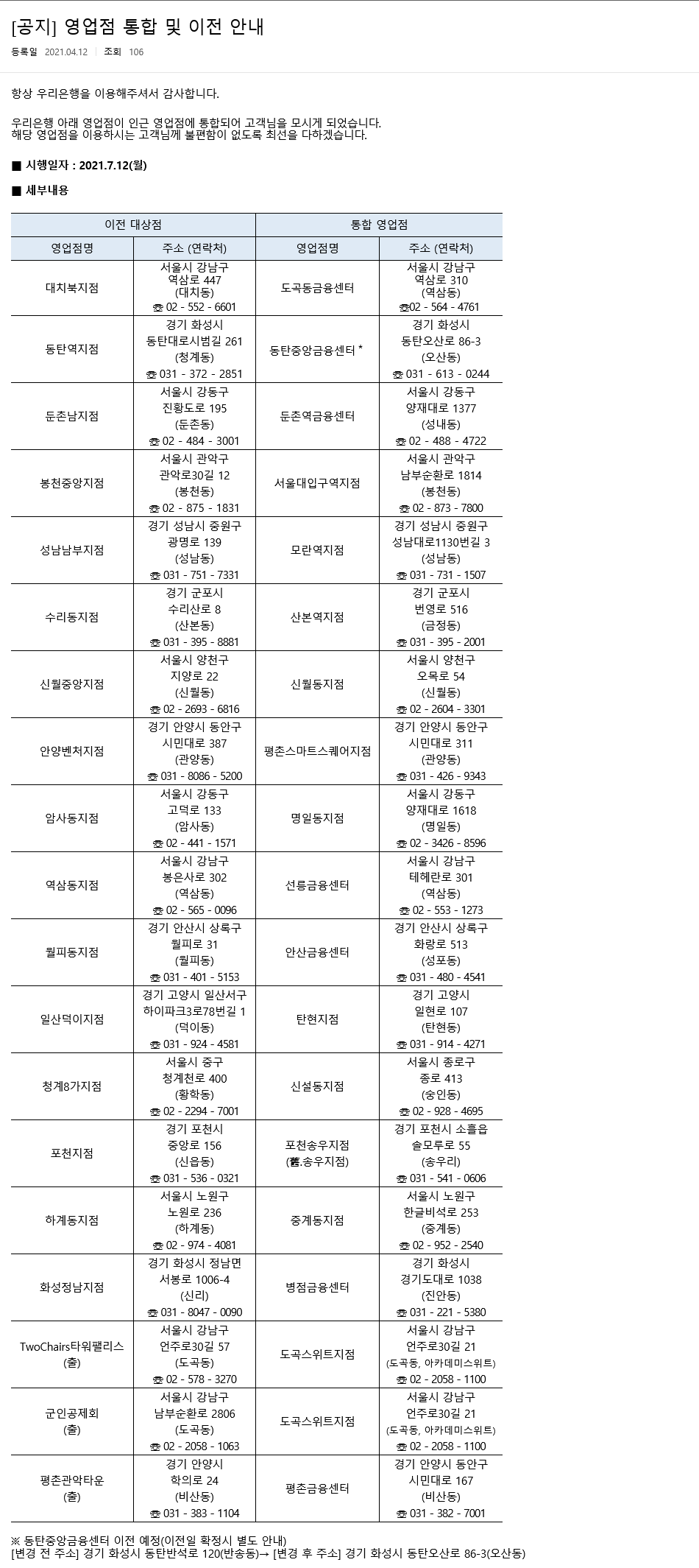 대치북지점, 동탄역지점, 둔촌남지점, 봉천중앙지점, 성남남부지점, 수리동지점, 신월중앙지점, 안양벤쳐지점, 암사동지점, 역삼동지점, 월피동지점, 일산덕이지점, 청계8가지점, 포천지점, 하계동지점, 화성정남지점, TwoChairs 타워팰리스, 군인공제회, 평촌관악타운을 이용하셨던 분들께서는 통폐합되는 위치를 잘 확인하시기 바랍니다.