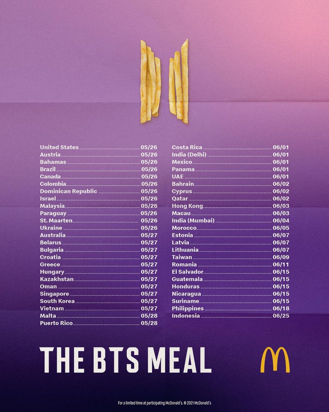 the BTS meal (BTS 세트메뉴) 라는 이름과 함께 전세계적으로 출시 예고가 나왔습니다. 그리고 우리나라는 5월 27일 출시라고 하네요. BTS와 아미의 대표적인 색상이 보라색이니까, 그와 관련하여 포도 칠러나 블루베리파이 같은 게 기본 구성으로 들어가지 않을까 예상해 봅니다. 어떤 구성의 어떤 메뉴, 그리고 어떤 굿즈가 함께 제공될지는 향후 추가적인 정보가 나오는 대로 업데이트 하겠습니다!