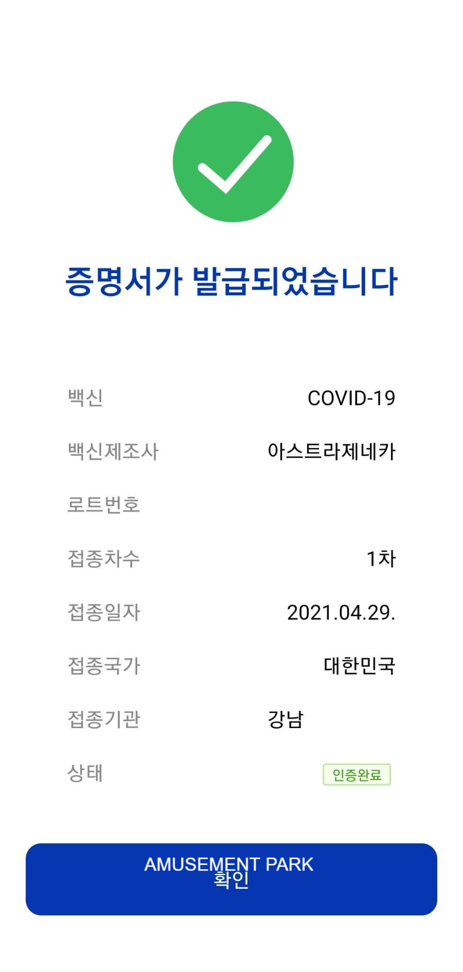 병원에서 최소 15분 동안 대기해야 합니다. 그 사이 쇼크 반응이 오거나 기타 알러지성 반응이 오는지 여부를 확인하기 위함입니다. 저는 아무 증상이 없었고 귀가 조치 받았습니다. 그리고 잠시 후에 2차 접종 일정까지 자동으로 지정되어 날짜와 장소가 포함된 메시지를 카톡으로 받았습니다.