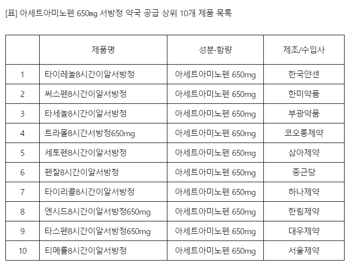 출처: 백신접종후 '타이레놀' 복용안내…약사회 "특정상표 언급말라" 연합뉴스 (yna.co.kr) 위의 대표적인 10가지 제품이 모두 동일한 아세트 아미노펜, 동일 용량 650mg입니다. 똑같은 약이라는 말입니다. 그래서 저는 한미약품의 써스펜 8시간 제품을 구입했습니다. 국내 브랜드도 많으니까 골라서 사시면 됩니다. 오히려 타이레놀 가지고 과거에 부작용 논란이 많이 있었죠.