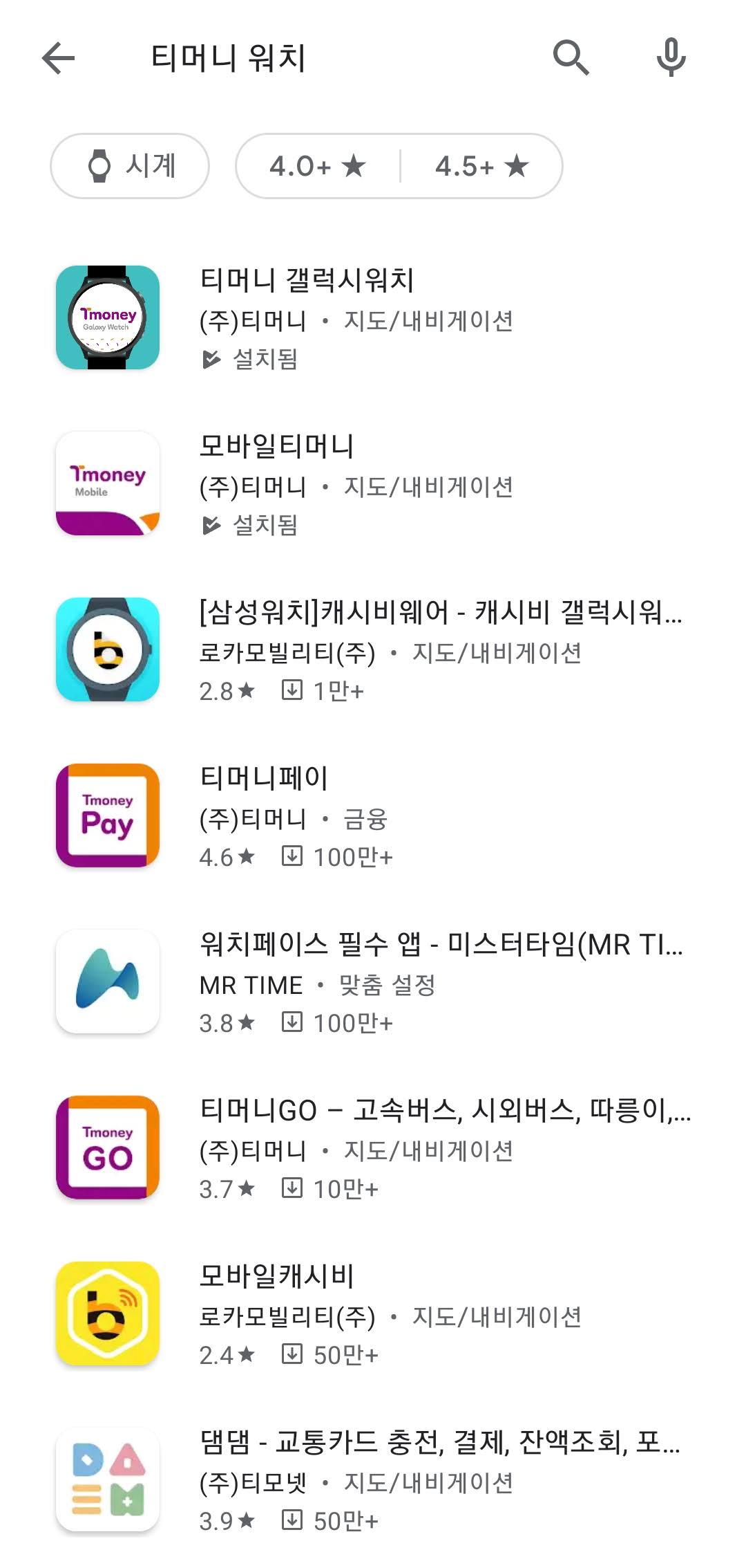 갤럭시 워치4에서 티머니 앱이 안 된다고 하는 이야기들이 많습니다. 깔끔하게 정리해 드립니다. 먼저 핸드폰에서 "플레이 스토어"에서 "티머니 워치"를 검색합니다. 그러면 아래와 같이 나올 겁니다.