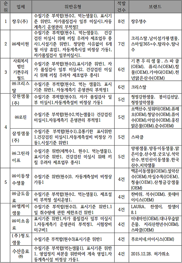 쿠팡 탐사수의 경우 납품업체 '삼정샘물, '기쁜우리월드 (현: 우리샘물)', '크리스탈 (현: 씨엠)'이 부적합 판정을 받았던 곳이라고 하고, '기쁜우리월드'와 '크리스탈'은 여러 차례 적발되어 현재는 사명을 '우리샘물', '씨엠'으로 바꾸고 영업 중이라는 소식도 나왔습니다.