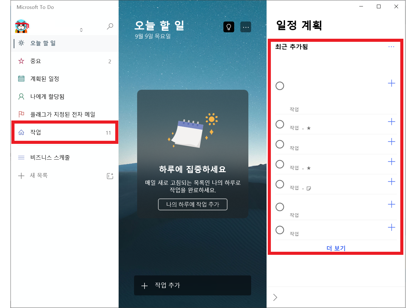 이후 윈도우10 디바이스의 스토어에서 Microsoft To Do를 설치하면 이렇게 전부 다 동기화 되어 들어와 있는 걸 보실 수 있습니다.