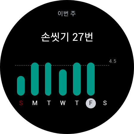 앱을 워치로 다운로드하고 실행하면 끝입니다. 첫 실행시 선택 권한 두 가지를 물어보는데, 이거에 동의하지 않아도 사용은 가능하다고 합니다만, 저는 모두 동의했습니다 ㅎ 그리고 위와 같이 몇 번 손을 씻었는지, 마지막 손 씻기가 언제였는지, 지난 한 주간 얼마나 손을 씻었는지 등을 모두 확인할 수 있답니다. 😀